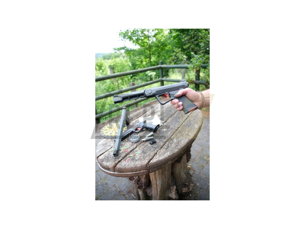 Přincip fungování: Natážení zlamovací jednoranové pružinové pistole k výstřelu se provádí lomením přední části hlavně. Jde to poměrně snadno. Po zlomení vložíte diabolku kalibru 4,5 mm do hlavně a vrátíte hlaveň zpět do původní pozice.