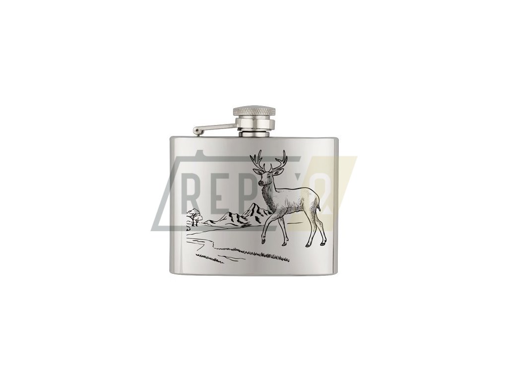 Placatka z nerezové oceli s motivem jelena a přírody. Skvělý dárek pro všechny lovce, myslivce a milovníky přírody. Praktické šroubovací víčko, které je připevněné k tělu placatice, aby se neztratilo.