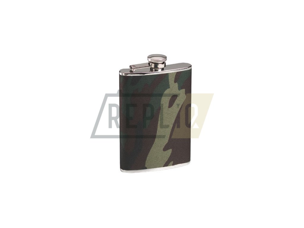 Nerezová placatice se šroubovacím víčkem a nylonovým potahem s maskováním Woodland, objem cca 225 ml.