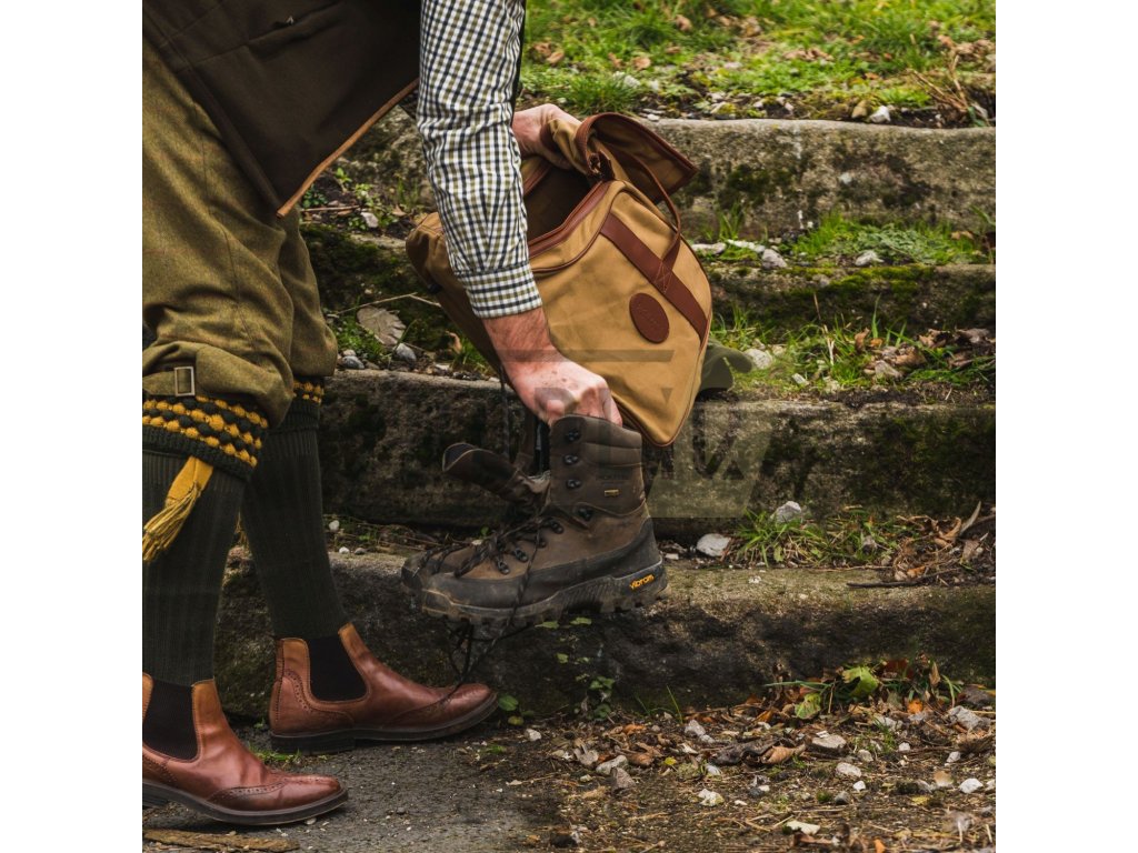 Atraktivní design s koženými doplňky. Přístup do tašky je pomocí dvou zipů, které jsou spojené táhlem - nemusíte tak otevírat každý zip zvlášť. Taška se pohodplně přenáší v ruce pomocí popruhy, pokud stojí na zemi, chrání ji alespoň částečně před znečištěním malé plastové "nožičky". Na boku tašky je logo anglické značky, která tašku vyrábí - Jack Pyke.
