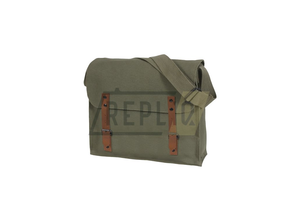Jednoduchá taška přes rameno ve stylu zdravotnických tašek, u nás známá též jako chlebník. Je vyrobena ze silného bavlněného plátna ve vintage stylu. Zapínání je řešeno pomocí kožených pásků s přezkou. Rozměry: 30 x 28 x 9 cm.