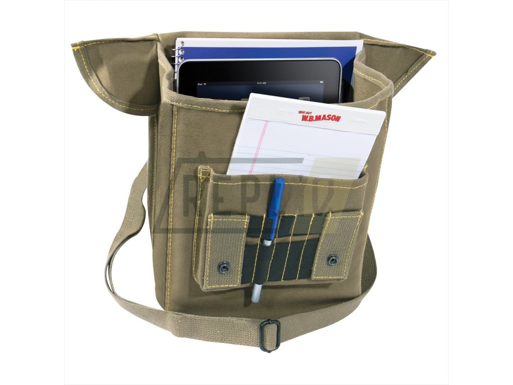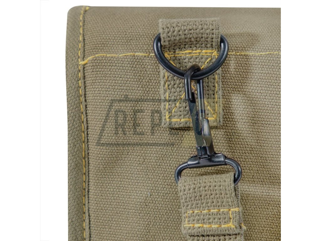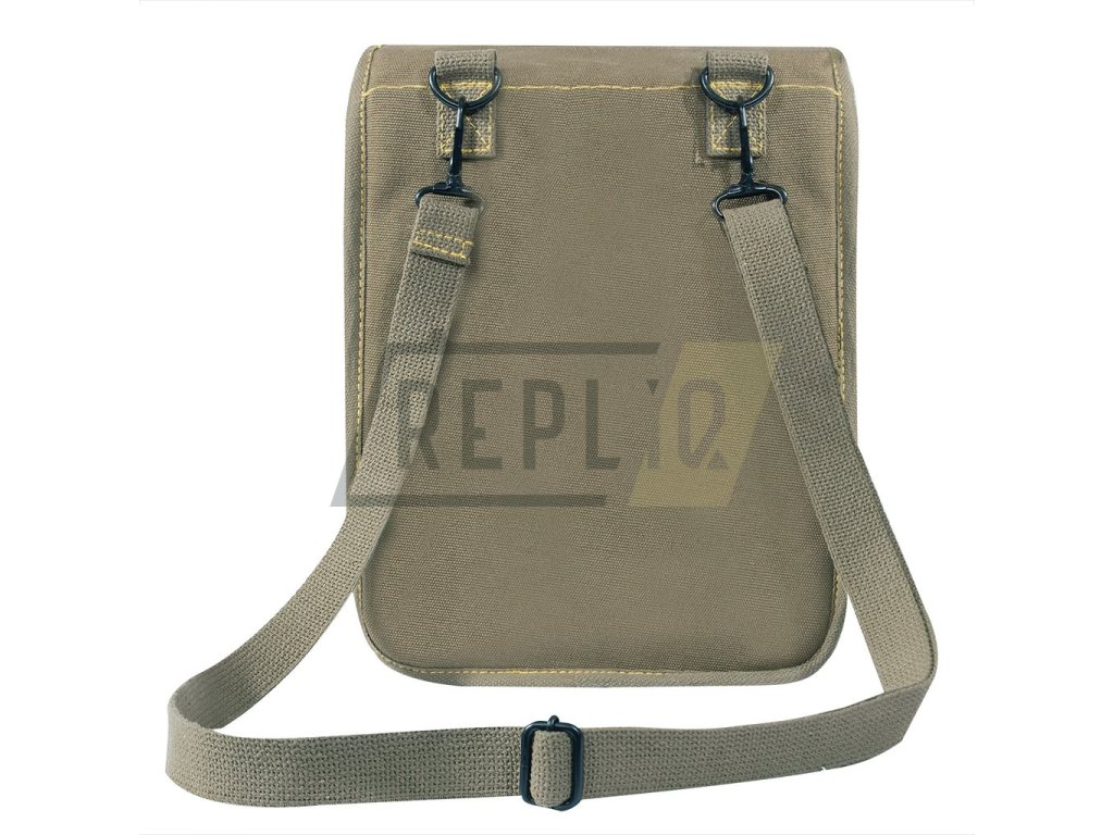 Nosný popruh tašky je délkově nastavitelný a díky kovovým přezkám jej můžete odepnout. Hlavní kapsa je přístupná skrze chlopeň se dvěma kovovými druky. Pod chlopní naleznete malý organizér pro psací prostředky a přihrádku ideální na vložení malého bloku či podobně rozměrného vybavení. Hlavní kapsa je bez dodatečného členění, bez problému ovšem pojme malý tablet, zápisník či mapu. Přední strana tašky je popsána ozdobným "armádním" nápisem.