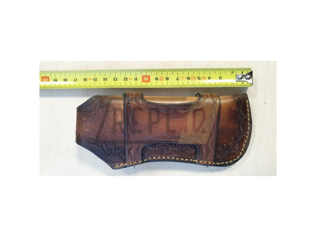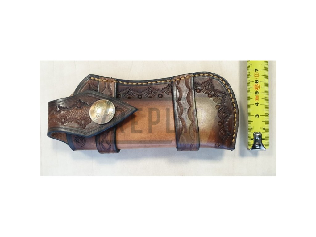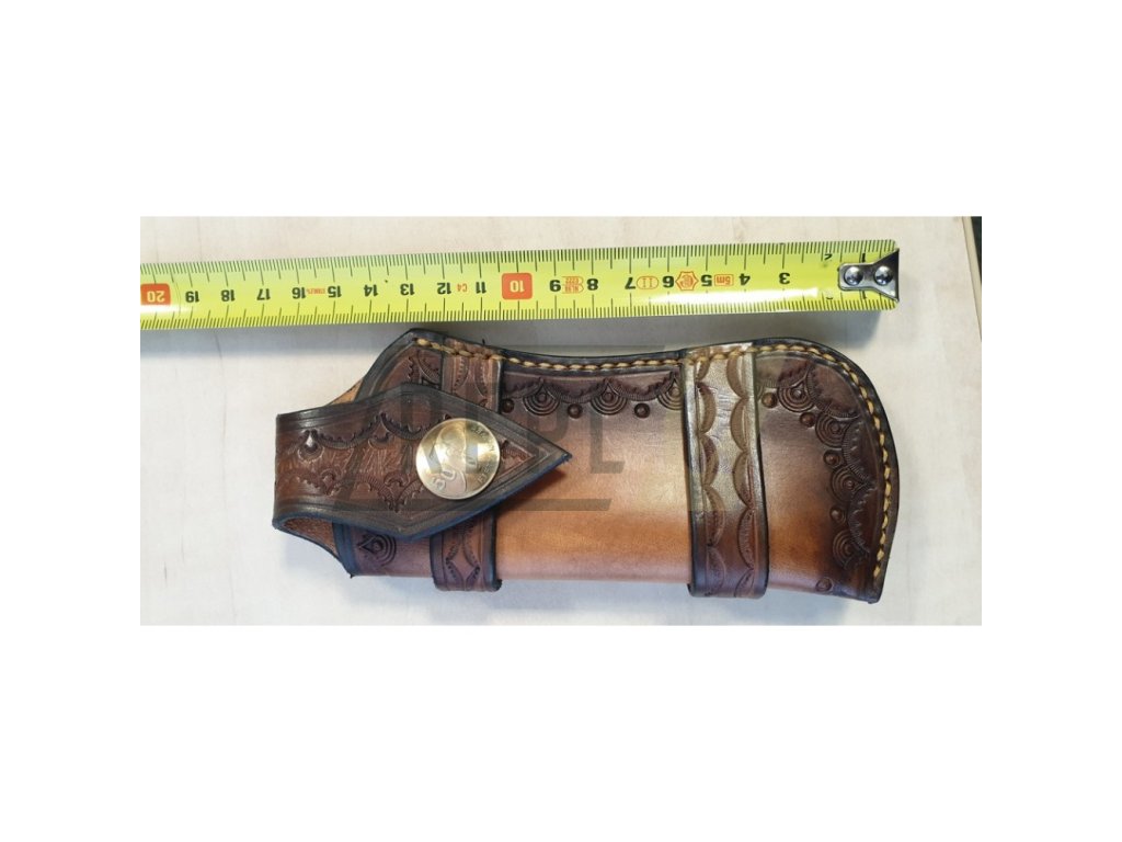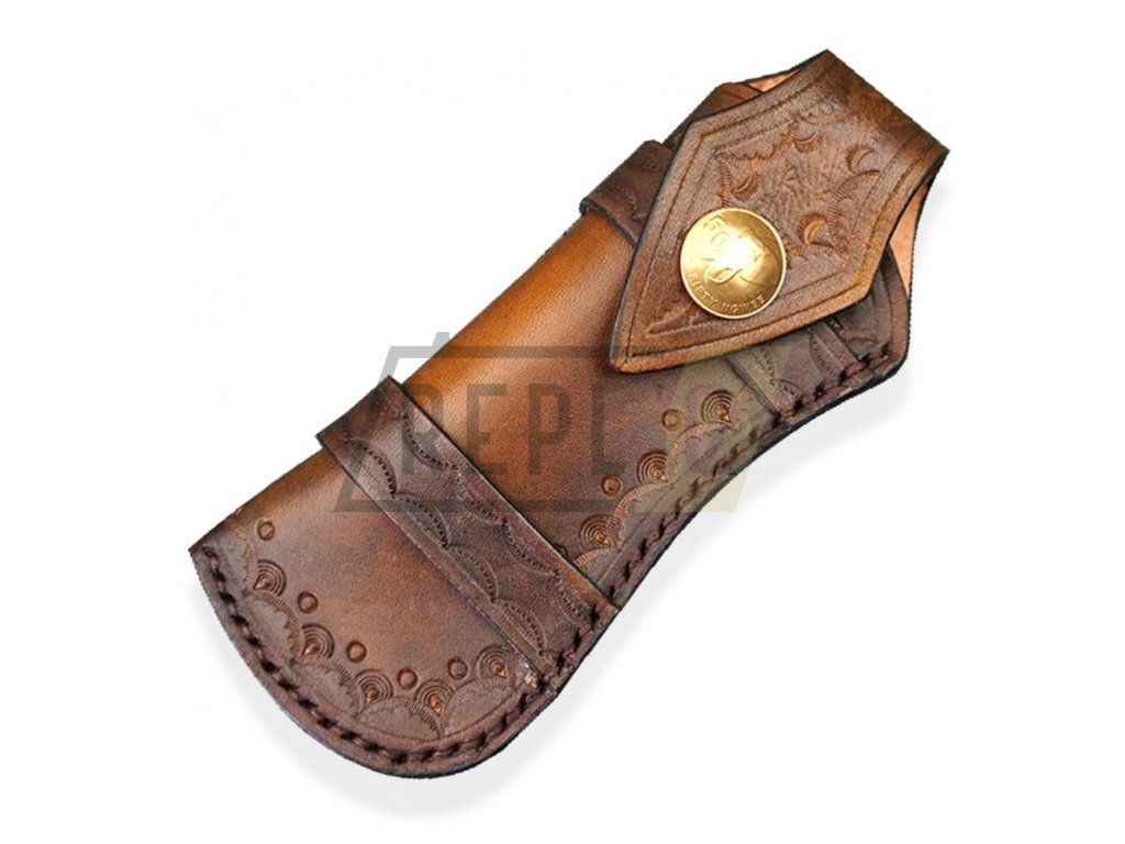 Kožené pouzdro má pevné uchycení pro připevnění k opasku, které je dostatečně velké pro pohodlné protažení opasku o šířce 5 cm na výšku i na šířku. Nůž je uvnitř koženého pouzdra uzavřen pevným cvokem.