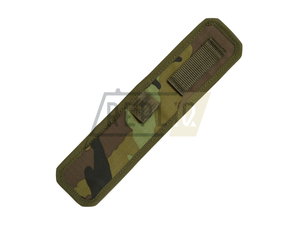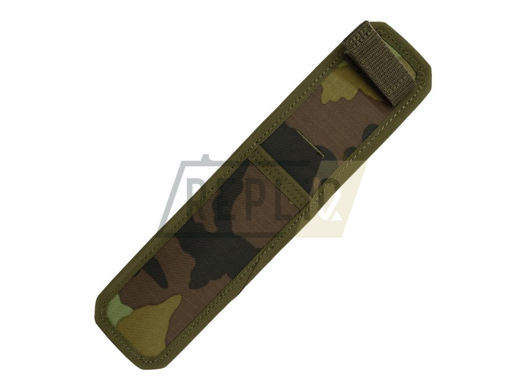 Klasické textilní maskáčové pouzdro bez kapsičky na příslušenství. Opatřeno kovovou planžetou bránící samovolnému vypadnutí nože.