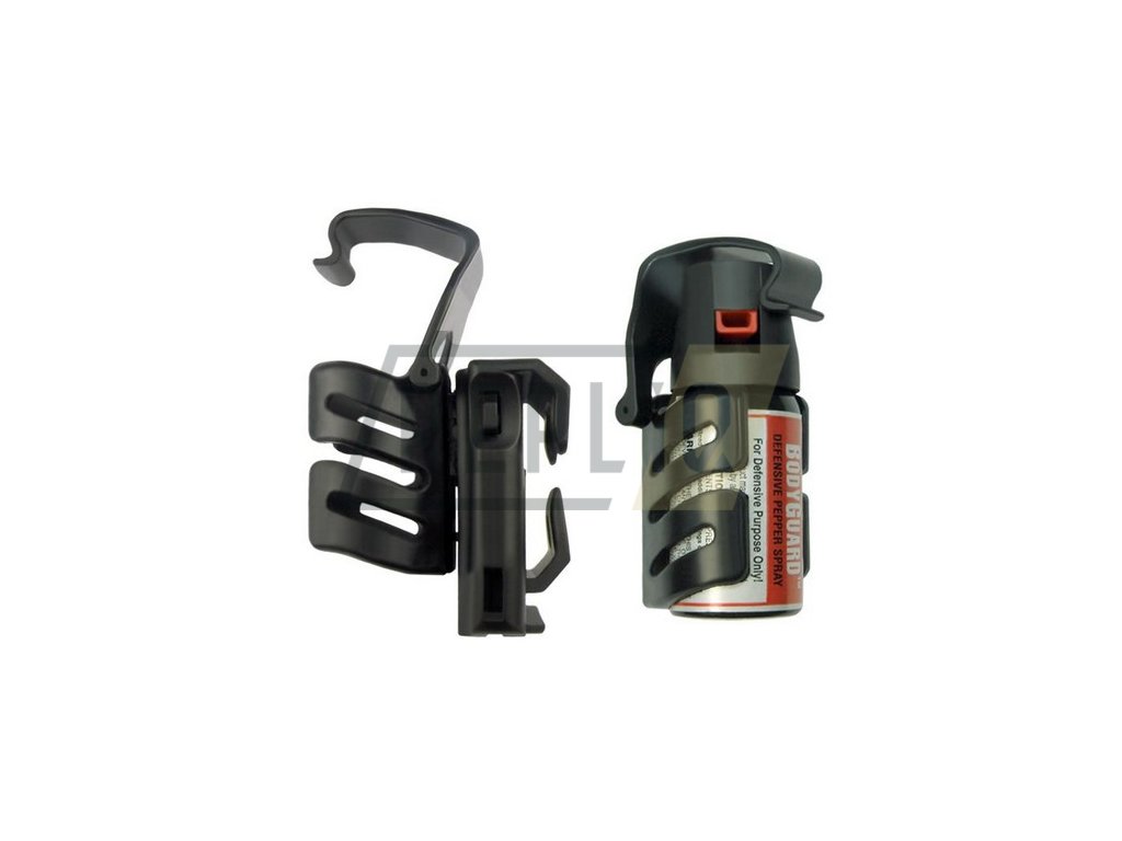 Bez nutnosti opasek odepnout. Sprej lze vůči opasku otočit v rozsahu 360 stupňů v 16 aretovaných polohách. Do pouzdra lze vložit spreje o průměru nádobky od 35 mm do 38 mm.