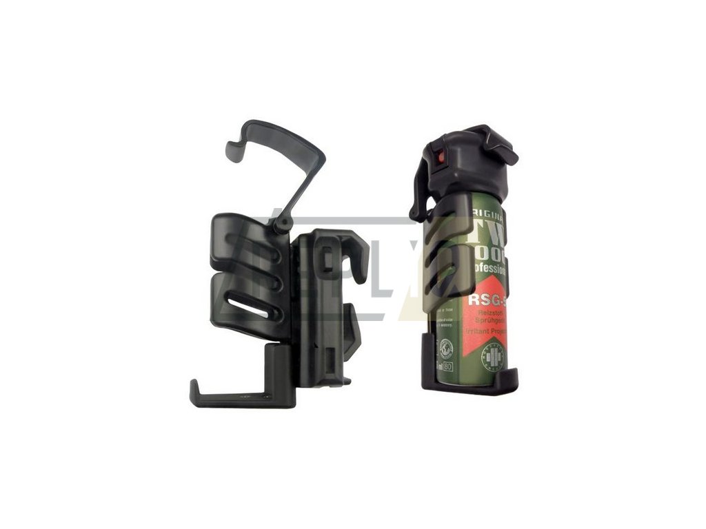 Speciální patentovaná upínací spona dovoluje rychlé nasazování pouzdra na opasek jednou rukou. Bez nutnosti opasek odepnout. Sprej lze vůži opasku otočit v rozsahu 360 stupňů v 16 aretovaných polohách. Do pouzdra lze vložit spreje o průměru nádobky od 35 mm do 38 mm.
