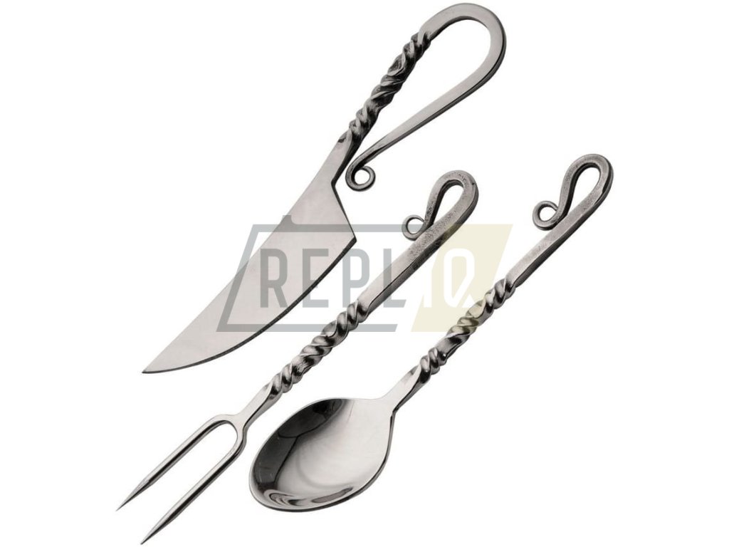 Třídílný set zdobeného historického příboru vyrobeného z nerezové oceli s vysokým podílem uhlíku ve slitině.