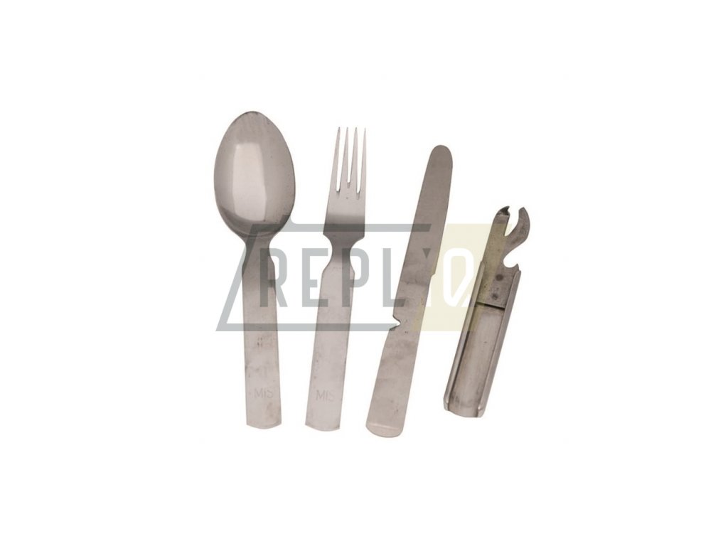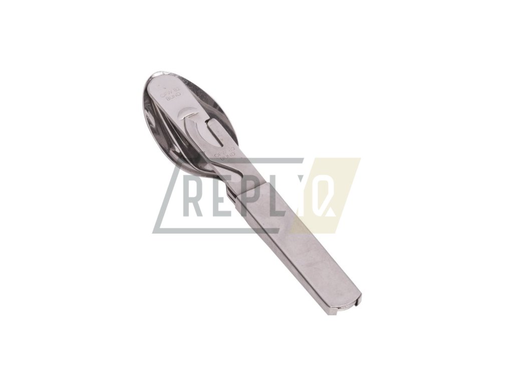 Použitý kompletní příbor z výprodeje NVA armády. Praktický pro přepravu - nůž, vidlička i lžíce se složí do rukojeti otvíráku.