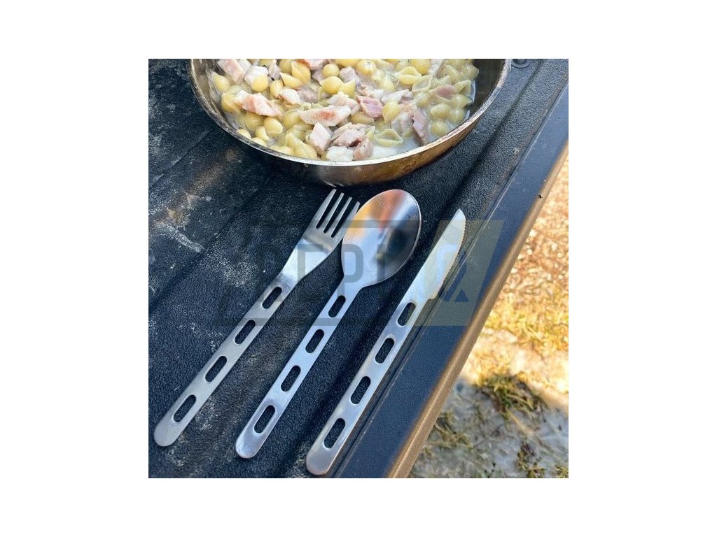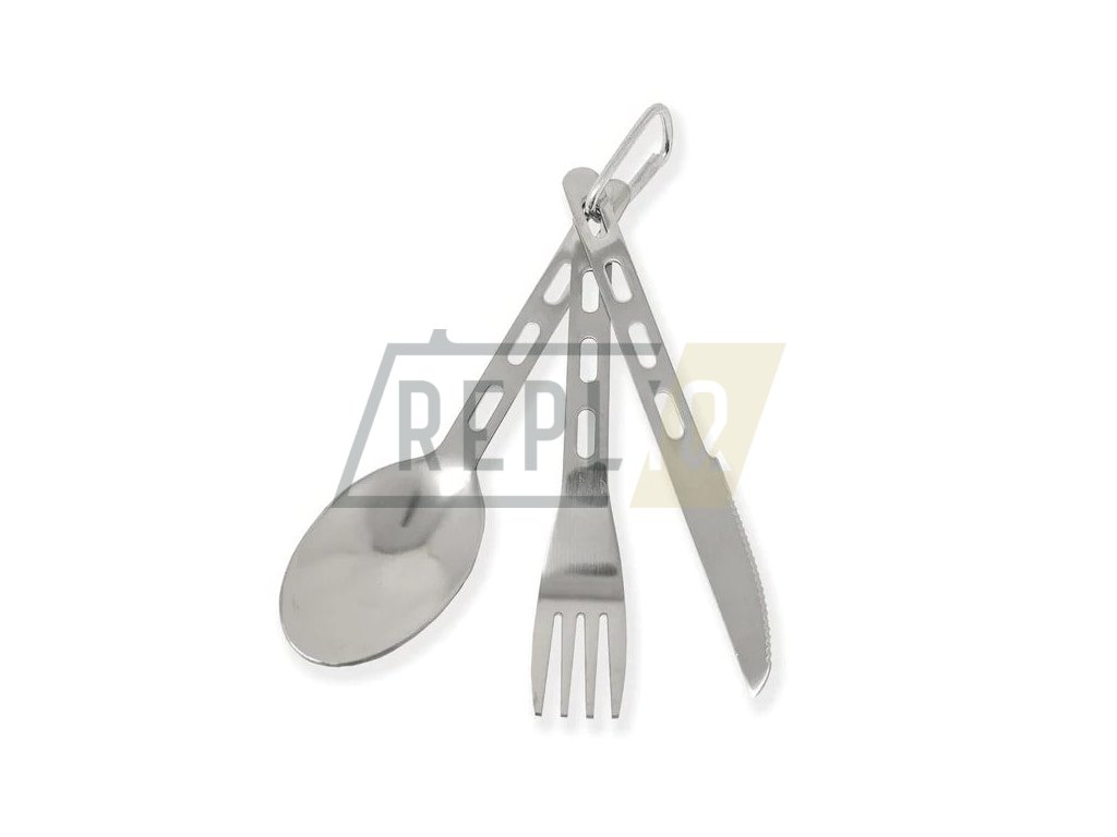 Sada příboru (nůž, vidlička, lžíce) na praktické karabině.