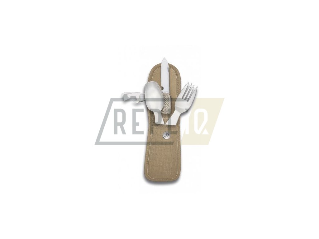 Zavírací nůž s čepelí s hladkým ostřím (oproti klasickým příborovým nožům je toto ostří opravdu ostré), který je doplněný dalším nářadím - pilkou, otvírákem na konzervy, otvírákem na láhve, šestiúhelníkovým klíčem. Na konci rukojeti je kovové očko s kroužkem. Lžíce a vidlička mají na konci otvor, vše tedy můžete zavěsit např. na karabinku a pověsit i bez pouzdra, kam bude potřeba.