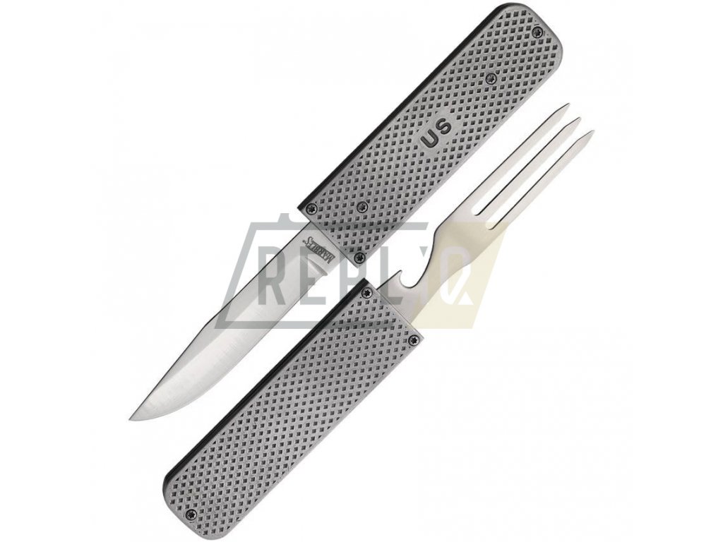 Praktický cestovní příbor, který svou konstrukcí vychází z příboru používaného pěchotou americké armády. Set tvoří nůž s hladkým ostřím a vidlička kombinovaná s otvírákem na láhve. Rukojeti / pouzdro nástrojů jsou vyrobené z odolné nerezové oceli. Při nepoužívání do sebe příbor snadno vložíte a nehrozí tak vaše poranění, ani poškození výbavy při přenášení.