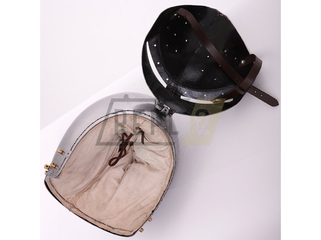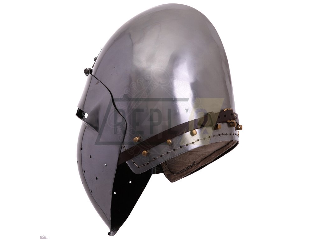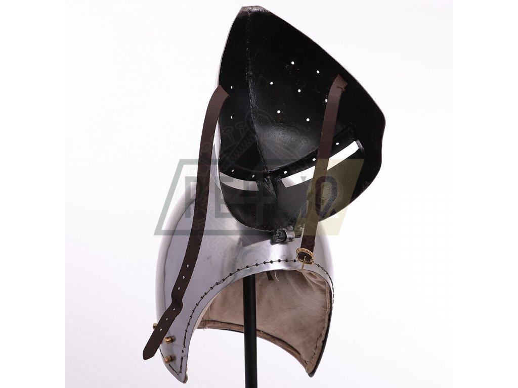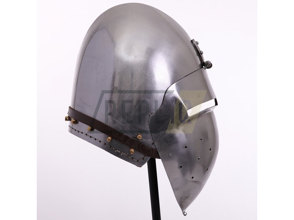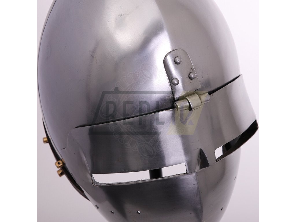 Vhodné na rekonstrukce z 14. a 15. století. Tato helma má mosazné úchyty pro připevnění kroužkového závěsu a kožený řemen pro upevnění hledí ve sklopené poloze. Vnitřní látková výstelka je nastavitelná koženou tkanicí. Kroužkový náplet není součástí dodávky.