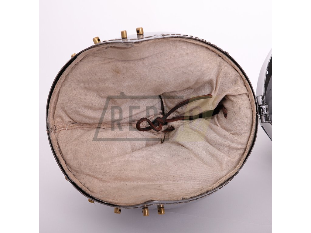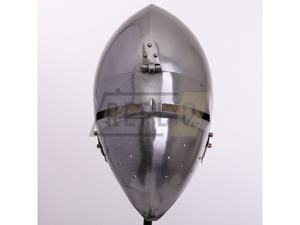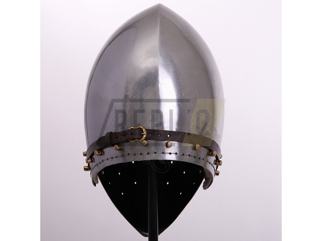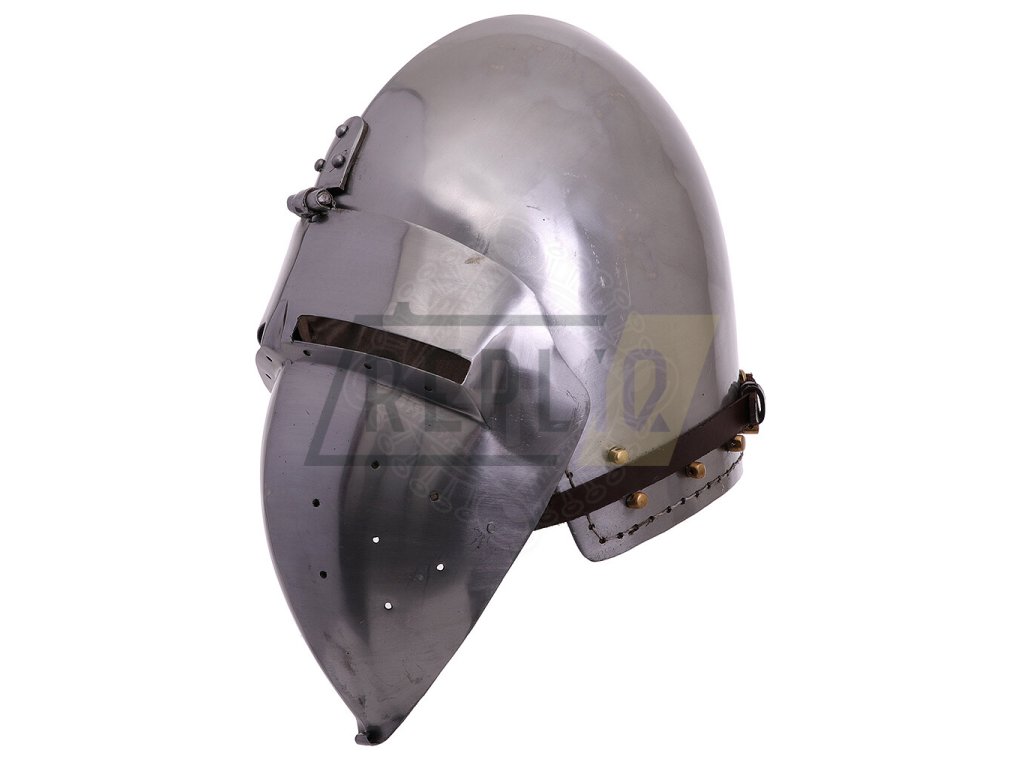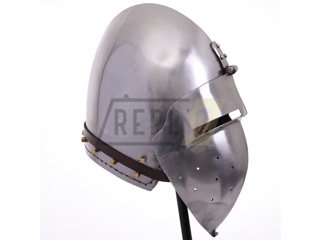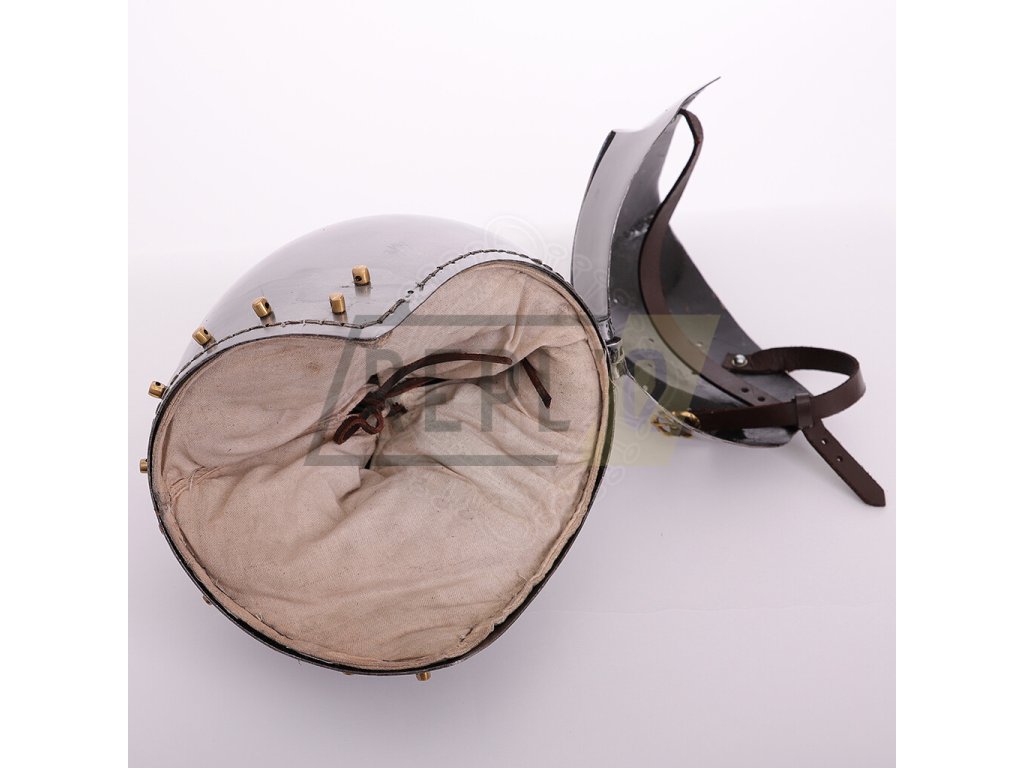 Vhodné na rekonstrukce z 14. a 15. století. Tato helma má mosazné úchyty pro připevnění kroužkového závěsu a kožený řemen pro upevnění hledí ve sklopené poloze. Vnitřní látková výstelka je nastavitelná koženou tkanicí. Kroužkový náplet není součástí dodávky.