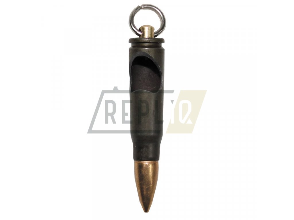 Přívěšek na klíče ve tvaru originální patrony 7,62 x 39 pro samopal AK47. Výřez v patroně slouží jako originální otvírák zátek.