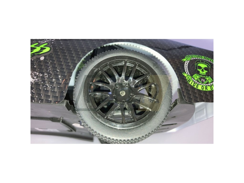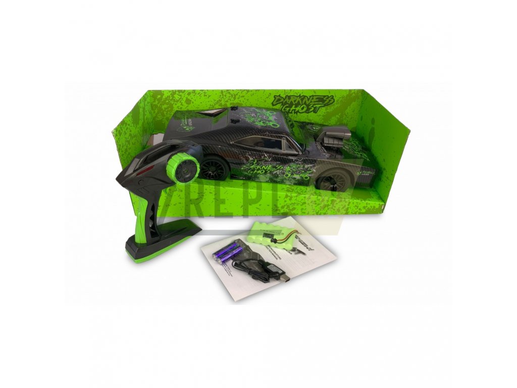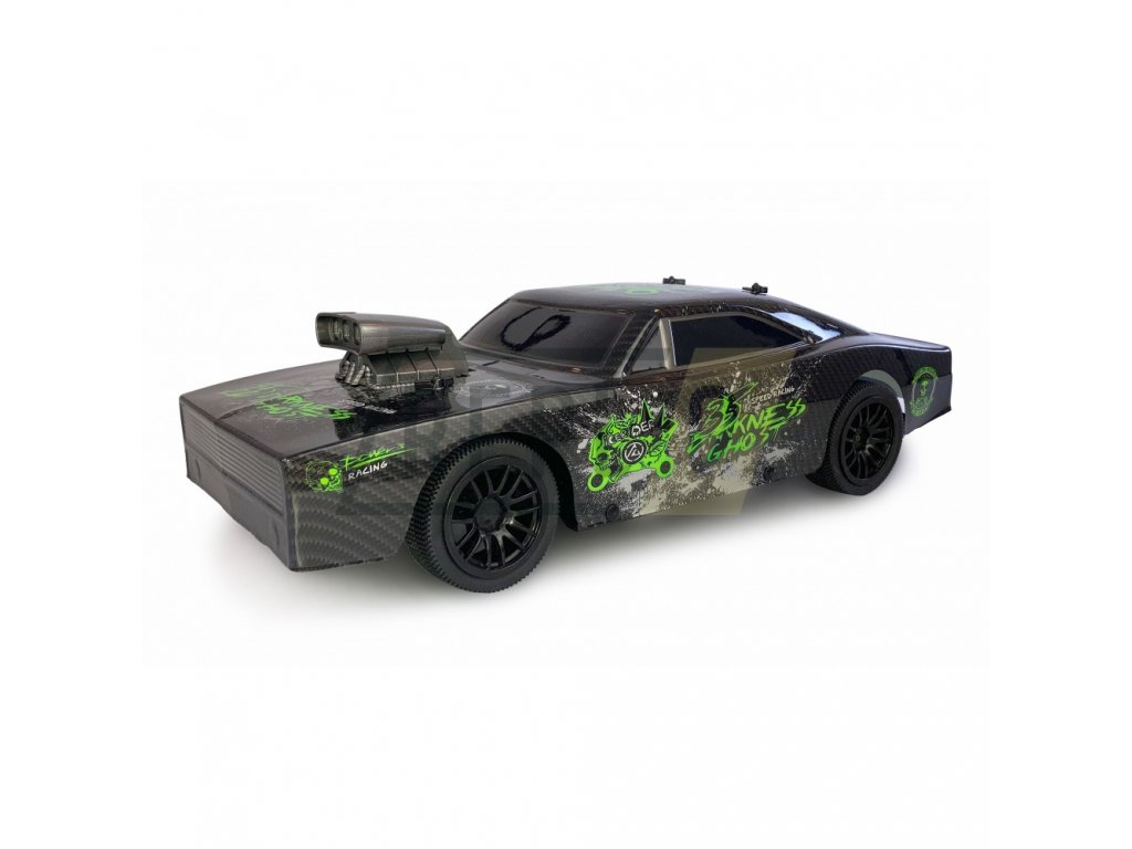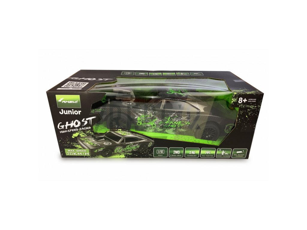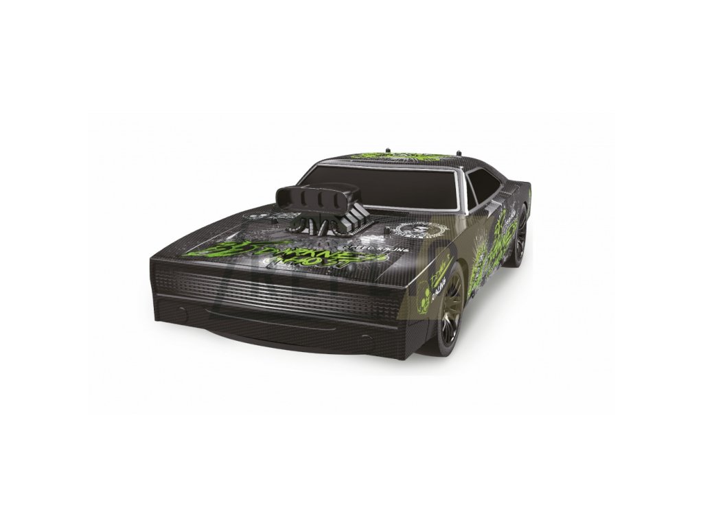 Brutální vzhled se setkává s vyspělou technologií – jinak se tato replika legendárního amerického muscle caru popsat nedá. Dálkově ovládaný MUSCLE CAR v měřítku 1:10 je dodáván ve verzi 2WD RTR připravený k jízdě, tzn. obsah balení skutečně zahrnuje vše potřebné pro provoz modelu. Poutavá neonově zelená v kombinaci s karbonovou karoserií a stylovými potisky dělá z RC Ghost Car skutečný poutač. Monstrózní kompresor uprostřed kapoty a černé ráfky s gumovými pneumatikami a vysokou přilnavostí navíc podtrhují silný závodní vzhled. Díky výkonnému elektromotoru a bezporuchovému systému 2,4 GHz se snadno ovládá. Pozoruhodná je maximální rychlost 20 km/h. Praktické pistolové dálkové ovládání umožňuje plnou kontrolu nad jízdou ve všech směrech (vpřed/vzad/vpravo/vlevo). S přiloženou Ni-MH baterií 7.2V 500mAh jsou možné jízdní časy přibližně 10 minut. Pokud dojde energie, lze baterii během krátké doby dobít pomocí kabelu USB.