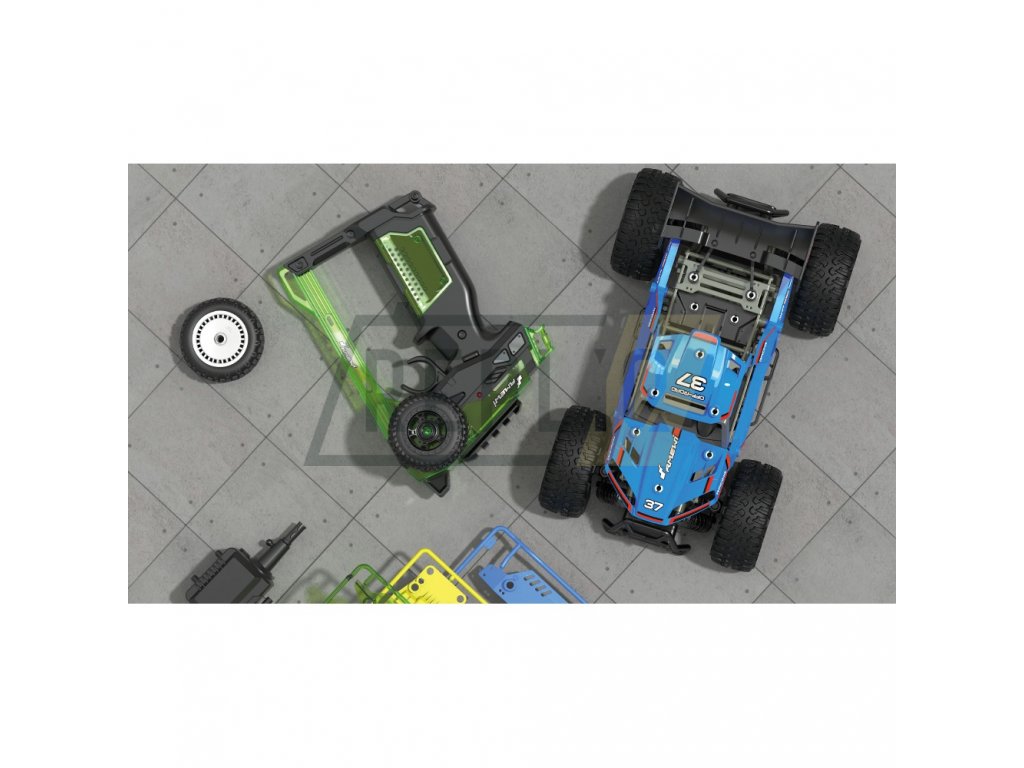 V RC STAVEBNICI COOLRC DIY naleznete skvělý závodní vůz s pohonem zadní nápravy 2WD v měřítku 1:18, který kombinuje zábavu ze stavby a poté rychlé jízdy. Díky inteligentnímu zásuvnému systému lze model s více než 70 kusy smontovat zcela bez použití nářadí do 30 minut a dokonce bez lepidla. Celé tělo je vyrobeno z pevného ABS plastu. Samolepky odolné vůči UV záření s trendy COOL vzory dodávají závodníkovi v případě potřeby osobitější vzhled. S pneumatikami vyrobenými z gumové směsi s vysokou přilnavostí, tlumiči nárazů a ochranou proti stříkající vodě je model vhodný i pro venkovní použití. Model dosahuje maximální rychlosti cca 8 km/h. Moderní 2,4GHz pistolové dálkové ovládání je již součástí dodávky. Pro uvedení modelu do provozu jsou vyžadovány pouze standardní domácí baterie pro model a dálkové ovládání.