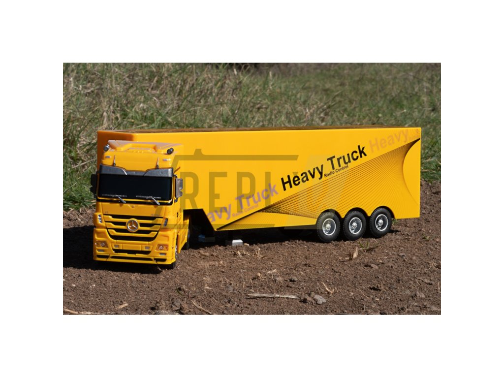 Nová vylepšená verze s nezarušitelným přenosem signálu 2,4 GHz a optimalizovanými světelnými a zvukovými prvky. Technologie 2,4 GHz umožňuje řídit více RC modelů současně, má větší dosah a je odolnější vůči rušení. Toto nákladní vozidlo zaujme svým designem a četnými funkcemi malé i velké dálkové řidiče. Například připojování a odpojování přívěsu lze realisticky provádět pomocí dálkového ovládání. O další zábavu se postarají zvuky motoru, výstražné zvuky při jízdě a couvání a také přední a zadní LED světla.