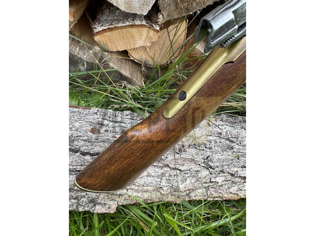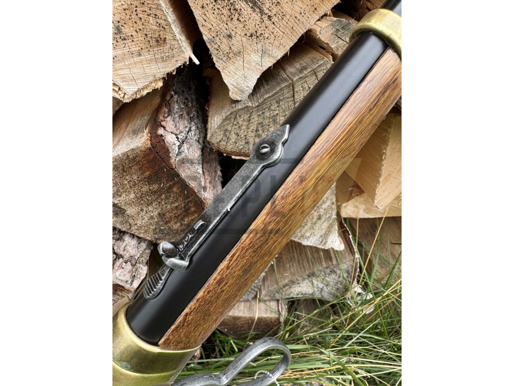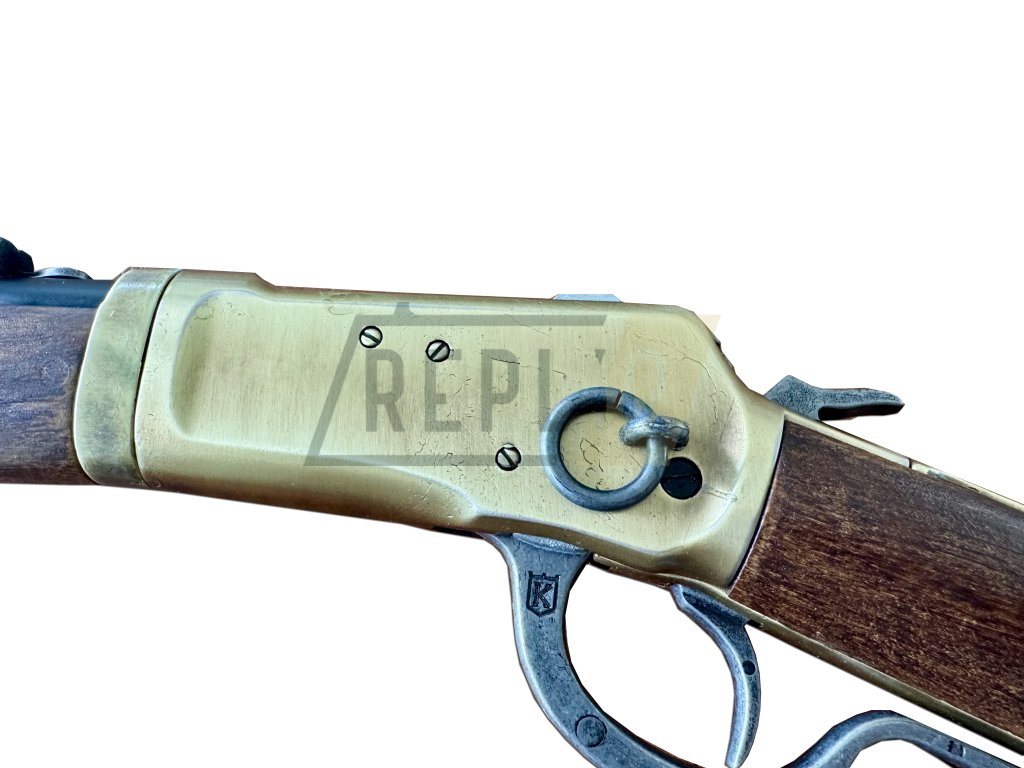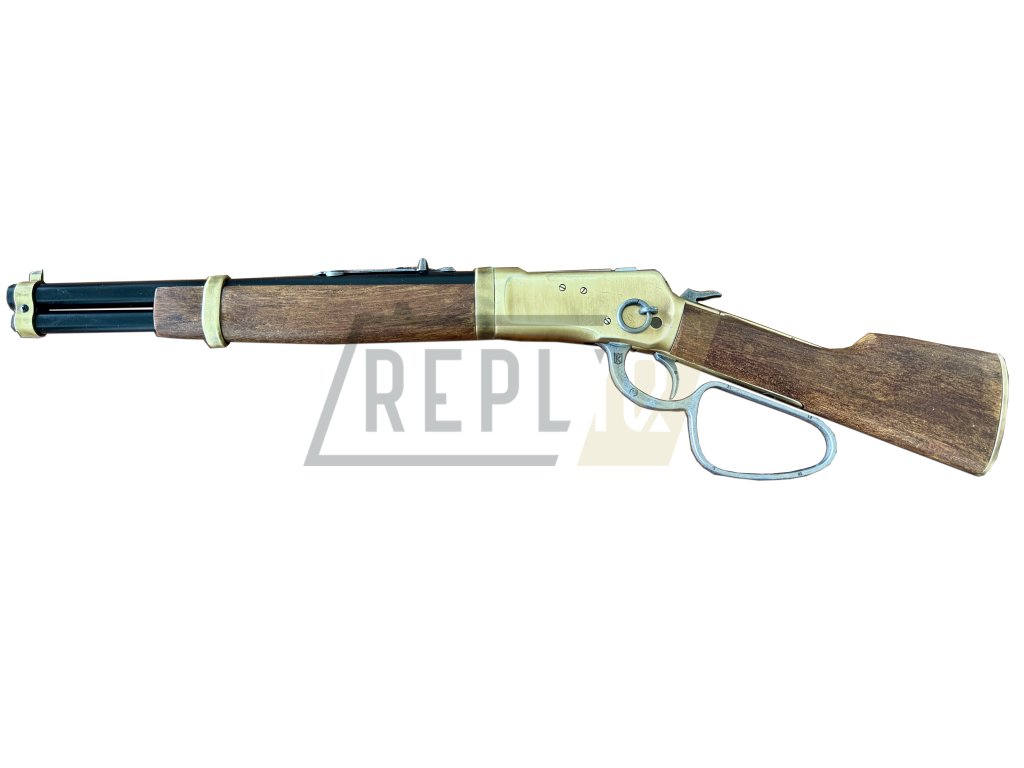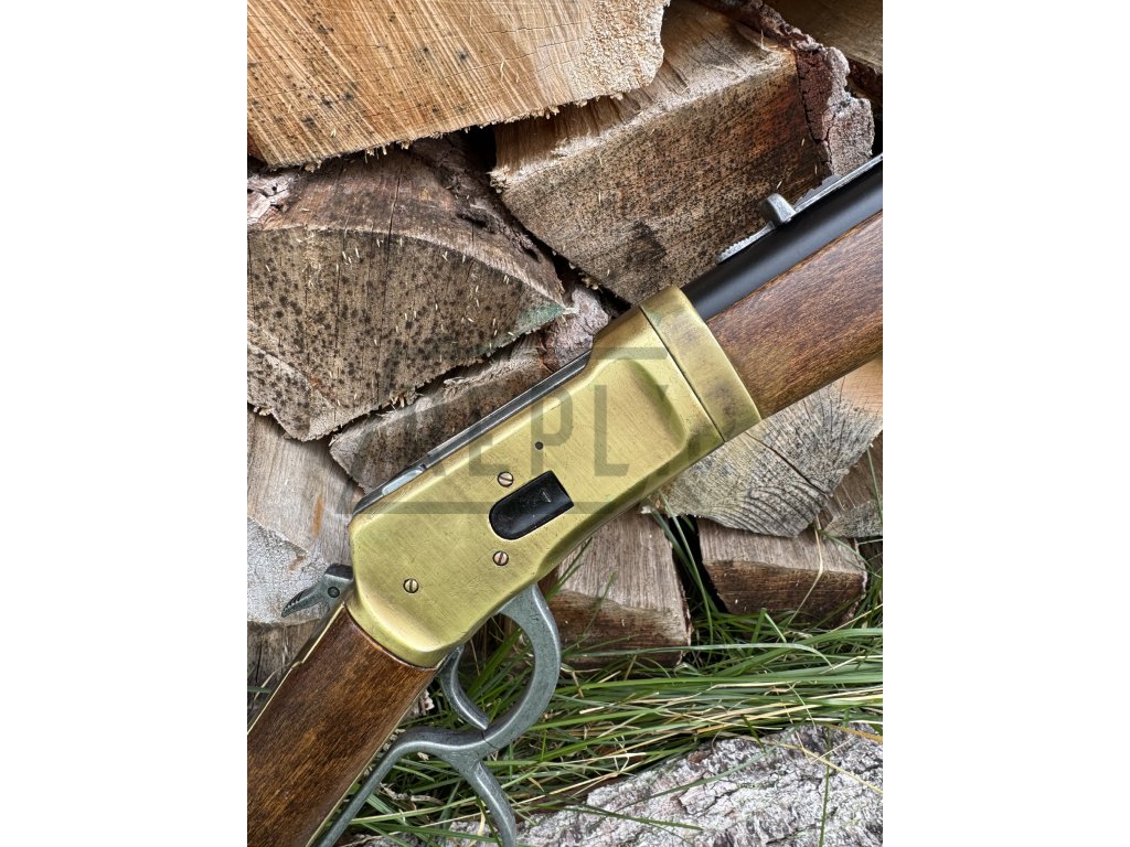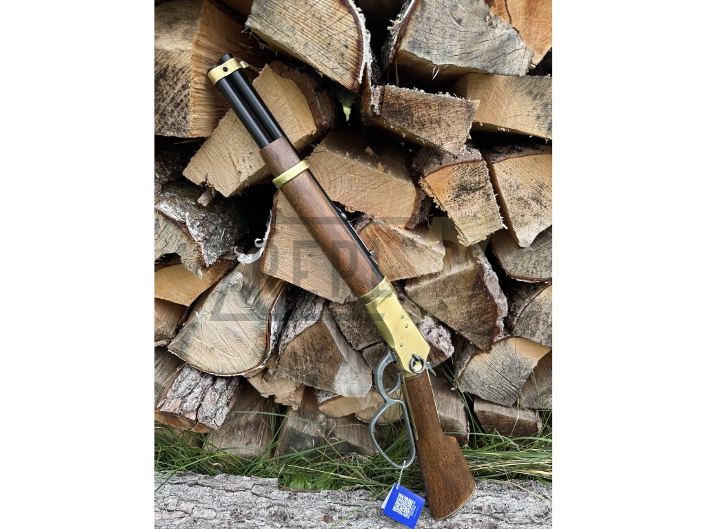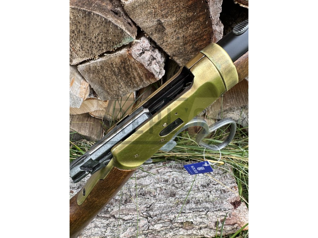 Replika pušky Winchester MARE´S LEG 26". 67 CM v mosazném provedení s možností nabití zbraně náboji, do kterých lze vložit kapslíky pro imitaci střelby. Jedná se o skvělou repliku od společnosti Kolser. Zbraň je dodávána s 3 kusy nábojů, které lze do pušky vložit a simulovat tak nabití zbraně. Puška vyhazuje nábojnice stejně tak jako ostrý model zbraně. Navíc lze náboje osadit kapslíky a simulovat tak střelbu.