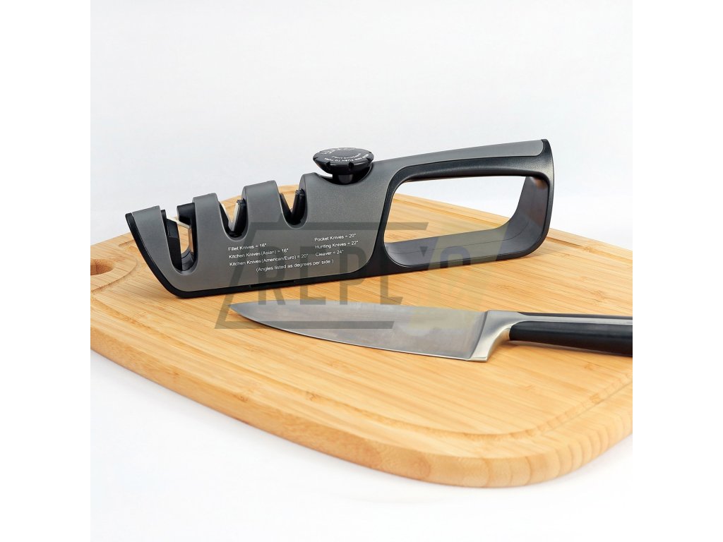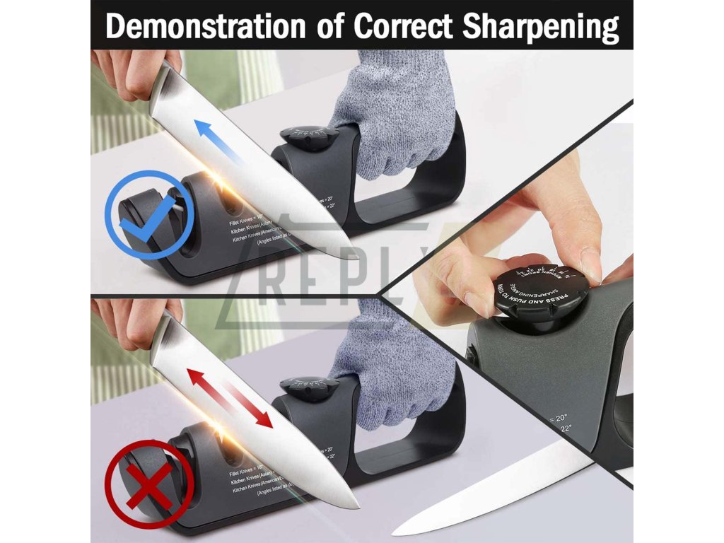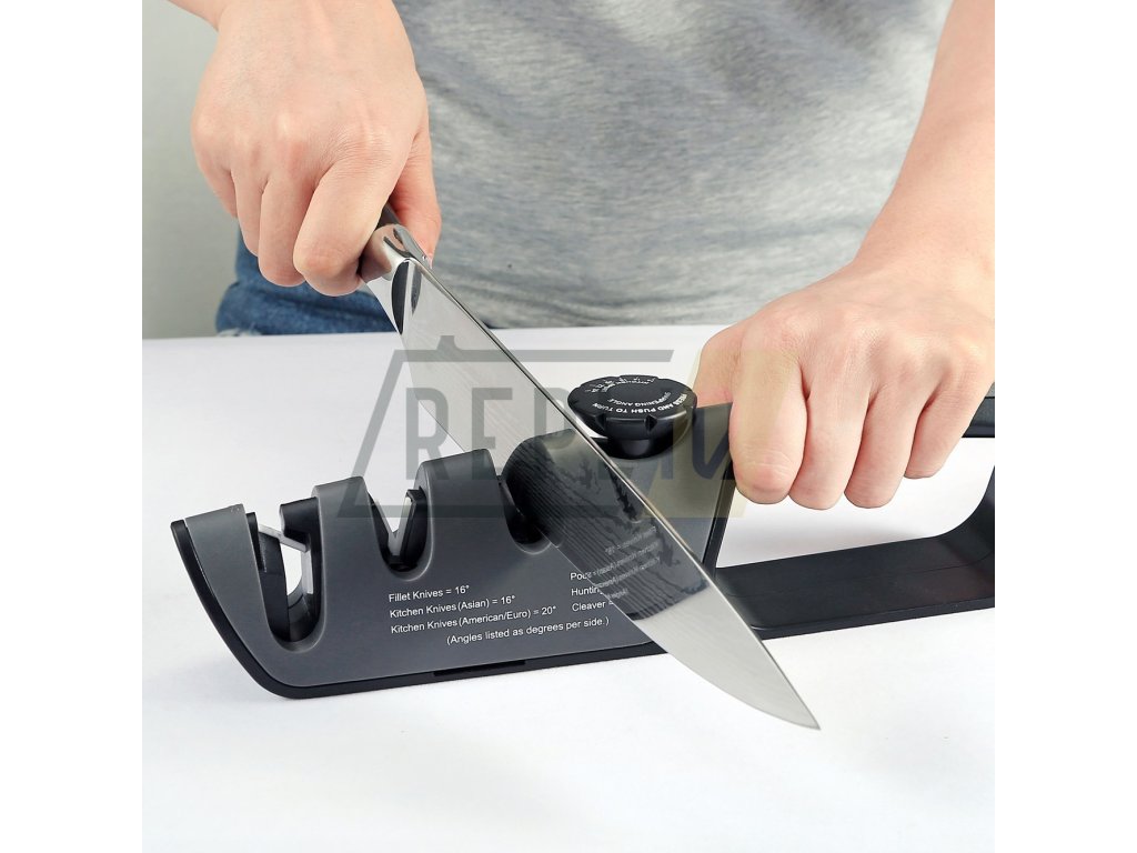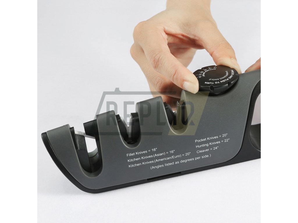 Nejdříve si zvolte požadovaný úhel broušení, toto uděláte nastavením voliče na hřbetu ostřiče. Zarovnejte ostří, toto je důležité u hodně tupých nebo poškozených nožů, nůž vložte do drážky v ostřiči označené COARSE a ve vodorovné poloze protáhněte 2x-6x ostřičem. Poslední krok broušení je dobroušení ostří, doleštění břitu, nůž vložte do V drážky FINE, kde ostří dohladíte, postup protahování je stejný jako při broušení. Pokud tento krok budete v kuchyni používat co nejvíce, budou vaše nože neustále ostré. Po broušení nezapomeňte nůž i ostřič důkladně opláchnout vodou. Pro broušení nůžek použijte největší drážku na konci ostřiče
