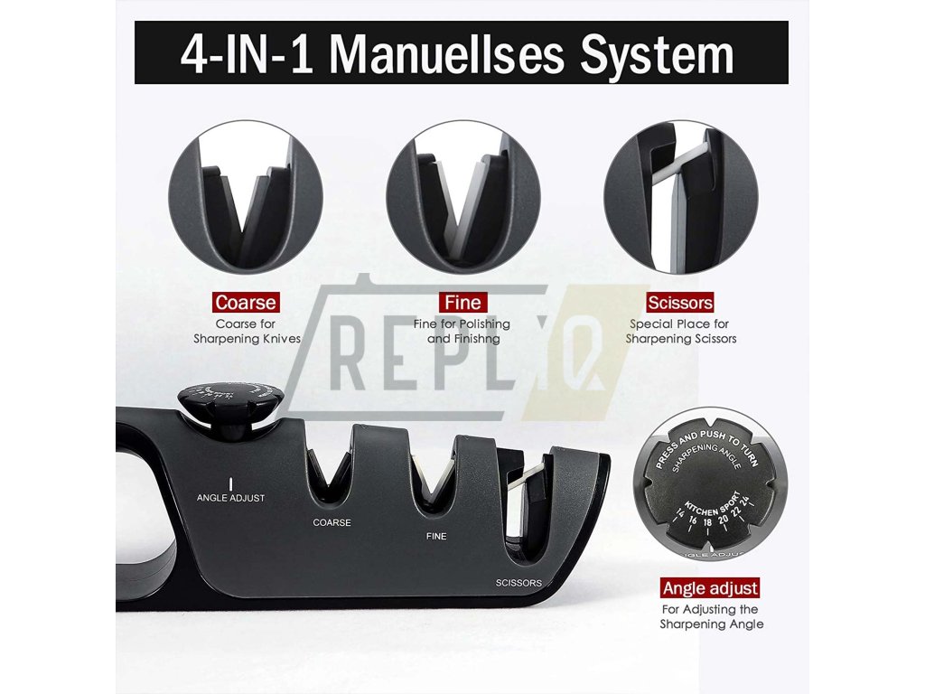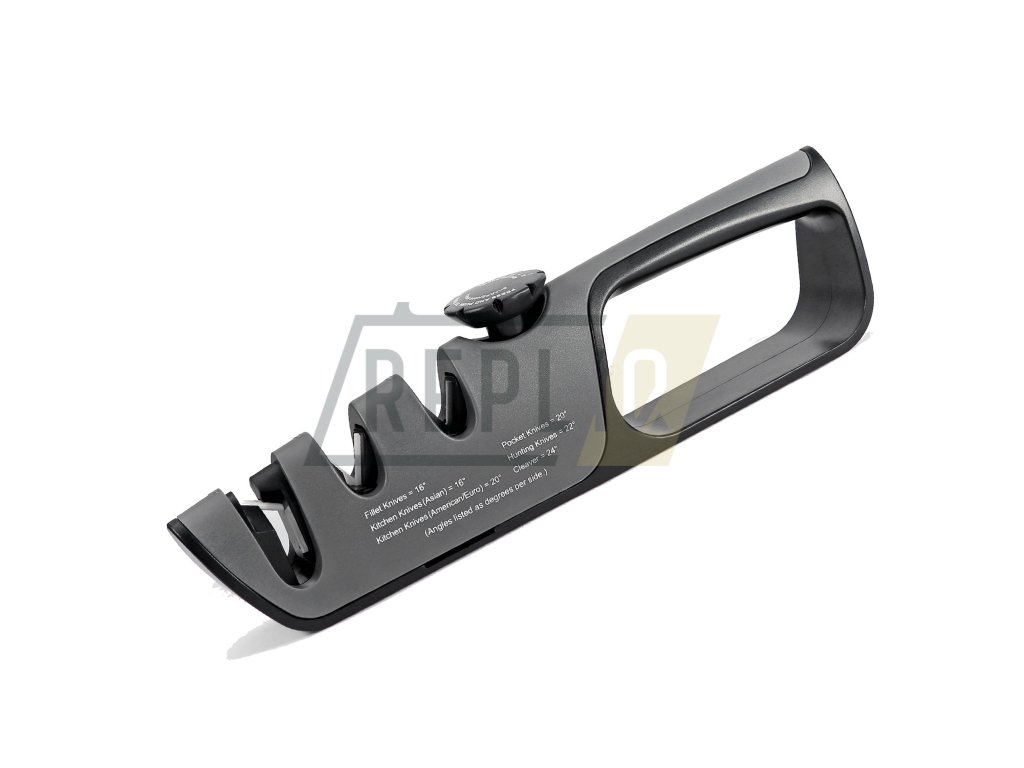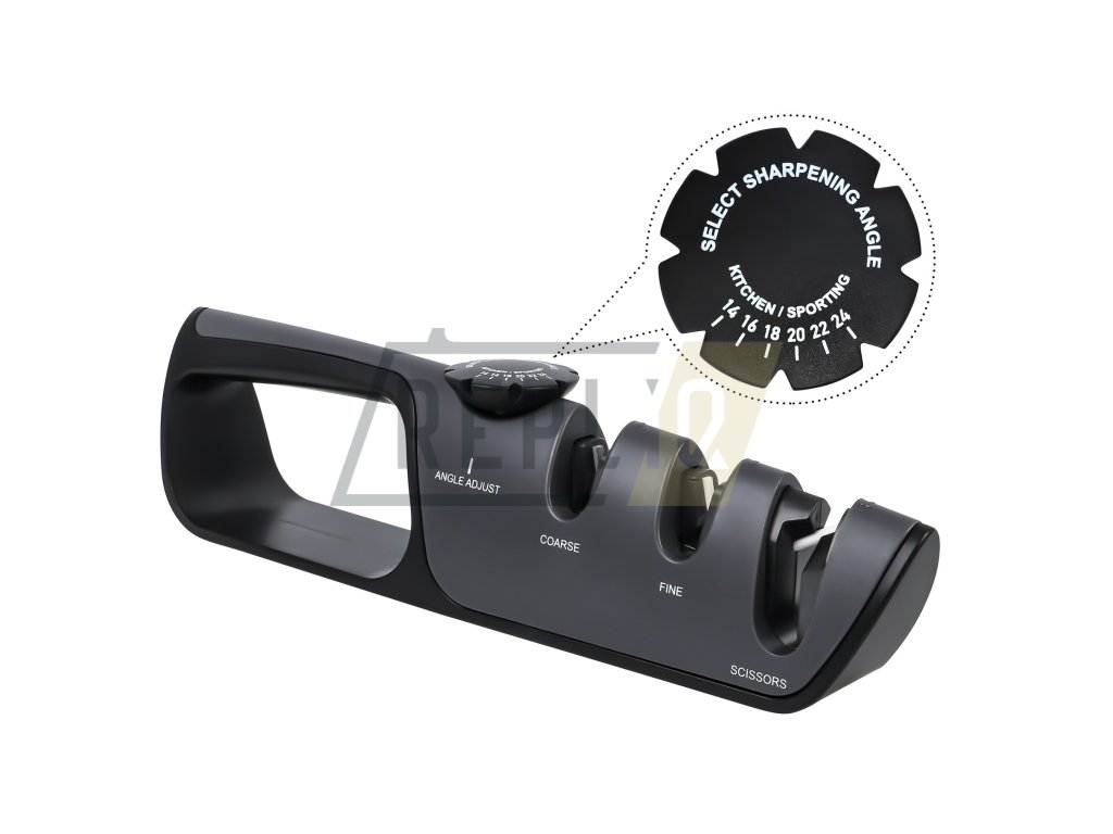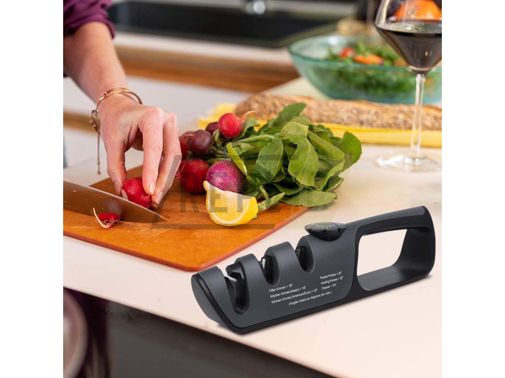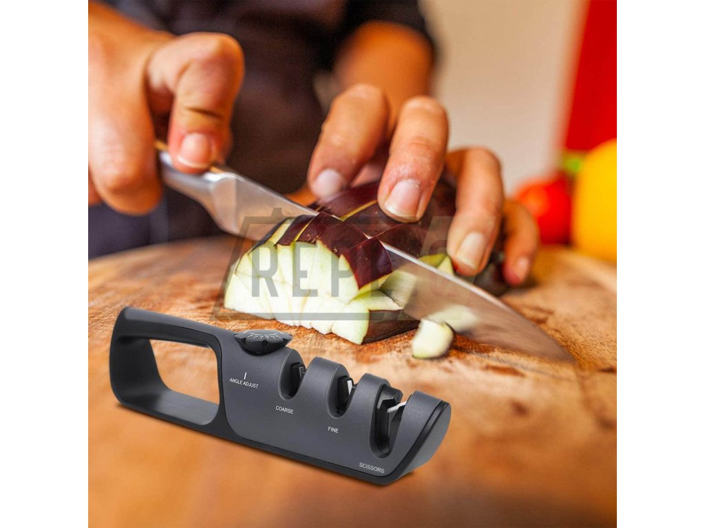 Nejdříve si zvolte požadovaný úhel broušení, toto uděláte nastavením voliče na hřbetu ostřiče. Zarovnejte ostří, toto je důležité u hodně tupých nebo poškozených nožů, nůž vložte do drážky v ostřiči označené COARSE a ve vodorovné poloze protáhněte 2x-6x ostřičem. Poslední krok broušení je dobroušení ostří, doleštění břitu, nůž vložte do V drážky FINE, kde ostří dohladíte, postup protahování je stejný jako při broušení. Pokud tento krok budete v kuchyni používat co nejvíce, budou vaše nože neustále ostré. Po broušení nezapomeňte nůž i ostřič důkladně opláchnout vodou. Pro broušení nůžek použijte největší drážku na konci ostřiče