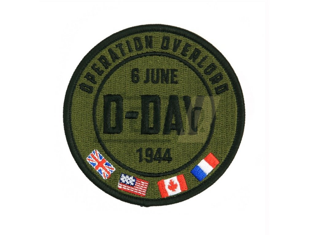 Uprostřed nášivky 6 June, D-Day a letopočet 1944, na okraji nápis Opereation Overlord a barevné vlajky Velké Británie, Spojených států amerických, Kanady a Francie.