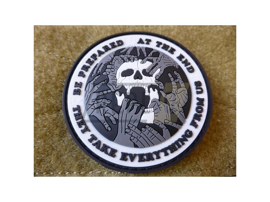 Plastová kulatá 3D nášivka na suchém zipu s nápisem BE PREPARED AT THE END, THEY TAKE EVERYTHING FROM US (buď připraven na konec, vezmou nám všechno) a vyobrazením lidské lebky, jak se po ní sápají ruce.
