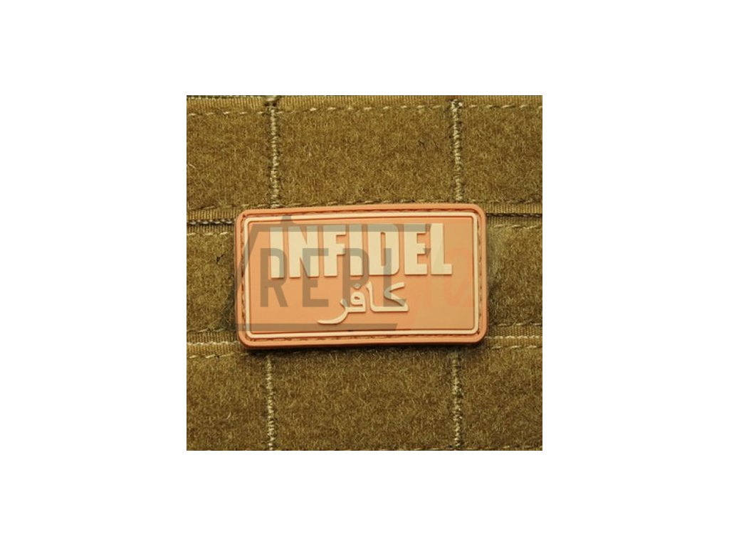 Nápis INFIDEL je v trojrozměrném provedení. Původní význam slova Infidel je anglické hovorové označení pro bezvěrce, nevěřícího, popř. věřícího v toho ne správného boha. V současné době nejčastěji využíván jako označení pro "ne muslim". Z toho důvodu je nápis na nášivce i v arabštině.