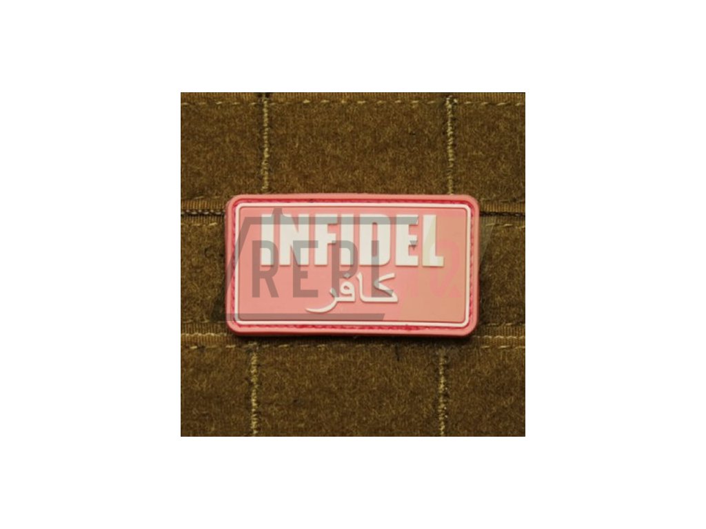 Nápis INFIDEL je v trojrozměrném provedení. Původní význam slova Infidel je anglické hovorové označení pro bezvěrce, nevěřícího, popř. věřícího v toho ne správného boha. V současné době nejčastěji využíván jako označení pro "ne muslim". Z toho důvodu je nápis na nášivce i v arabštině.