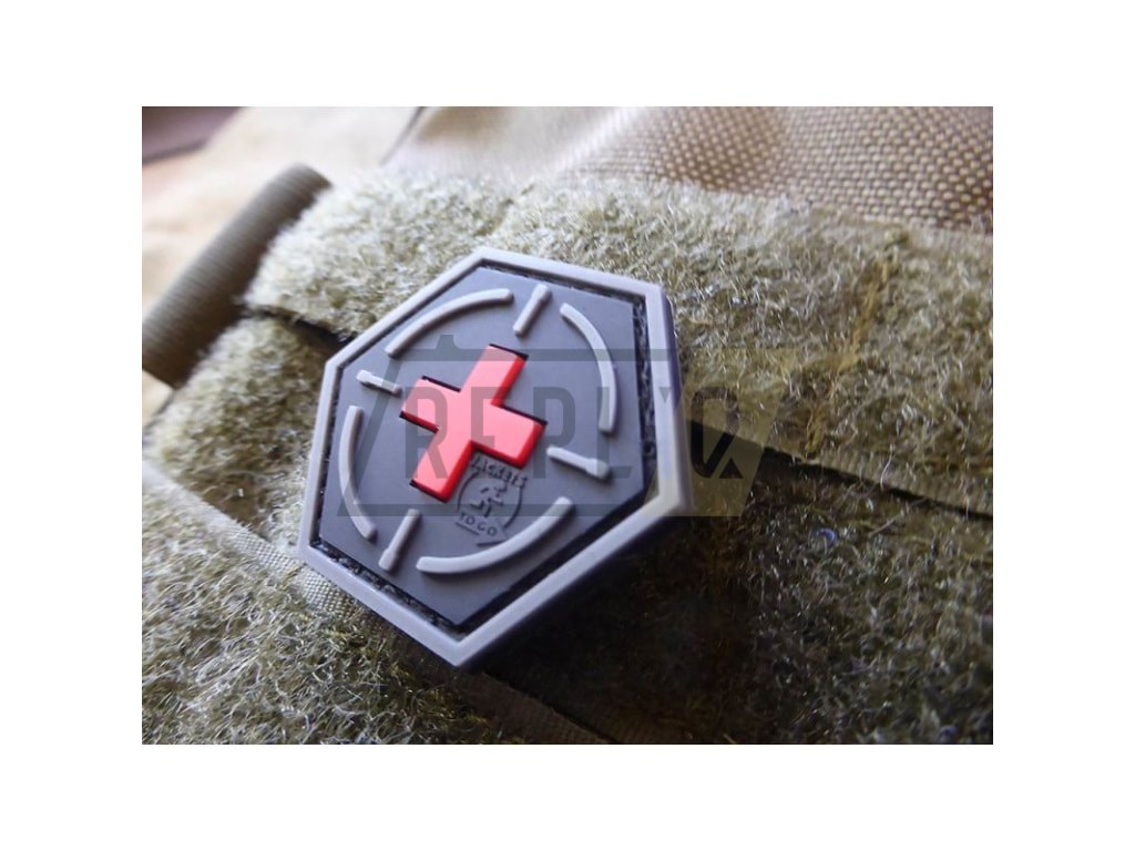 Plastová 3D nášivka pro zdravotníky, s červeným křížem ve středu šestiúhelníku.