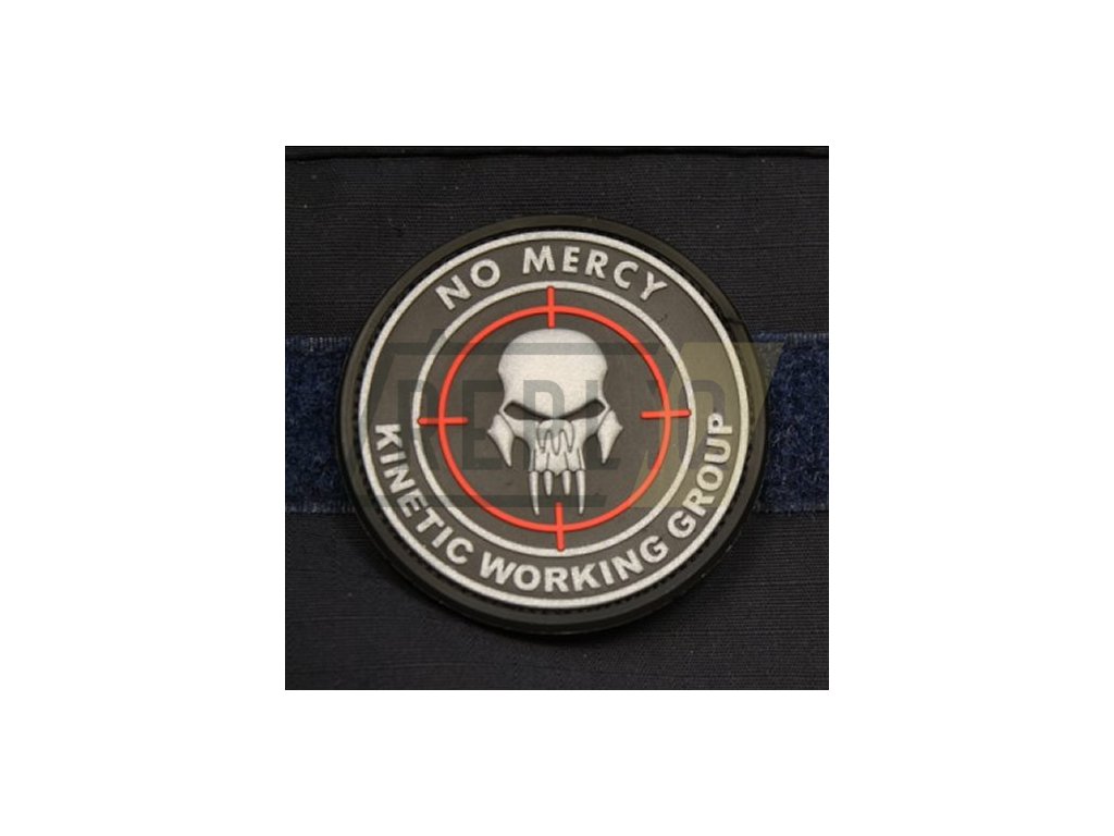 Plastová nášivka s motivem"No Mercy - Kinetic Working Group". Průměr cca 6 cm, na rubu se suchým zipem.