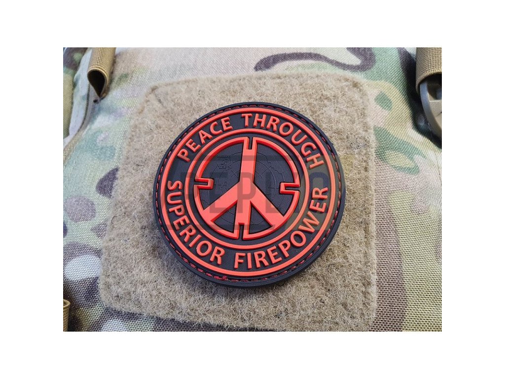Nášivka PEACE THROUGH SUPERIOR FIREPOWER plast velcro ČERNÁ/ČERVENÁ
