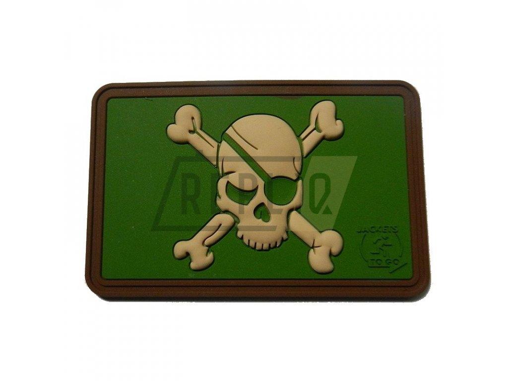 Plastová obdélníková nášivka na suchý zip, na které je pirátská lebka s páskou přes oko a zkřížené hnáty.