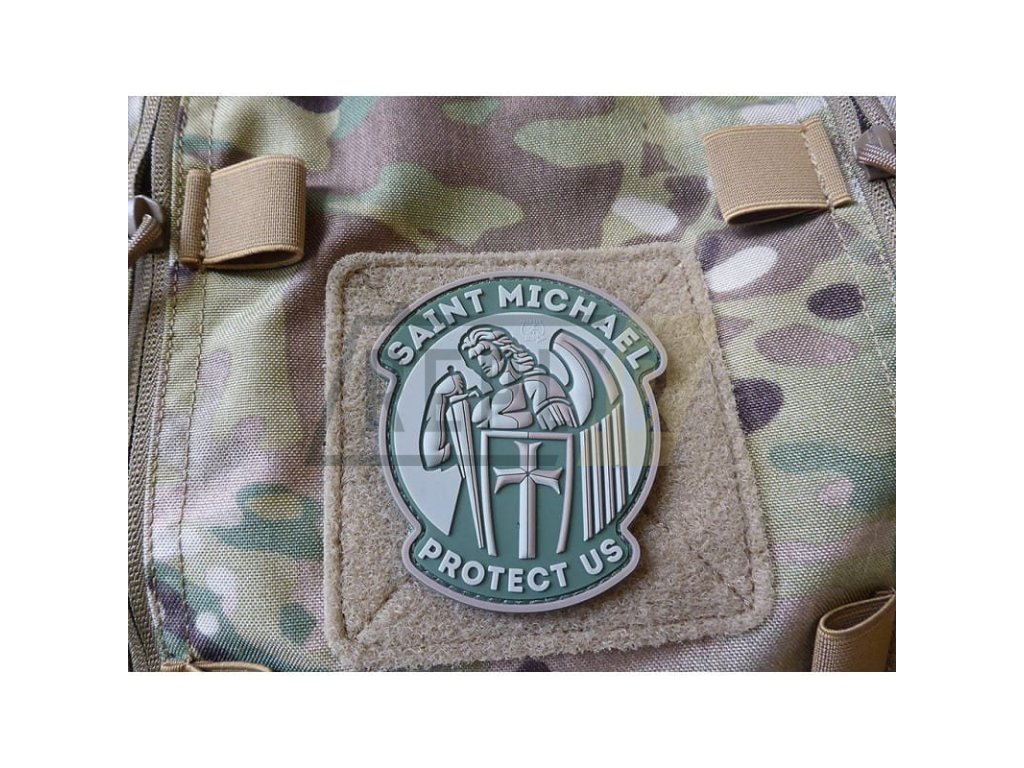 3D gumová nášivka na suchém zipu s Archandělem Michaelem, který v ruce drží meč a štít, a který je patronem a ochráncem policistů. Obrázek doplňují nápisy Sankt Michael Protect Us (svatý Michael nás ochraňuje).