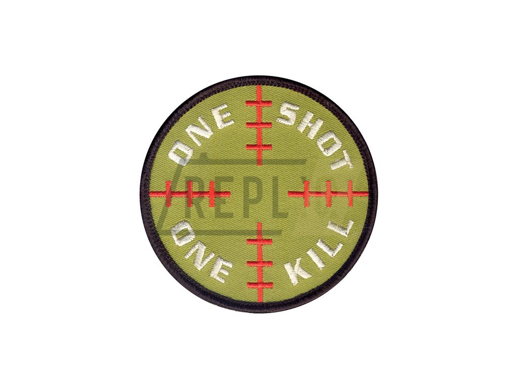Velcro kulatá nášivka s bílým nápisem ONE SHOT ONE KILL na zeleném podkladu s černou obrubou. Průměr nášivky 8 cm.