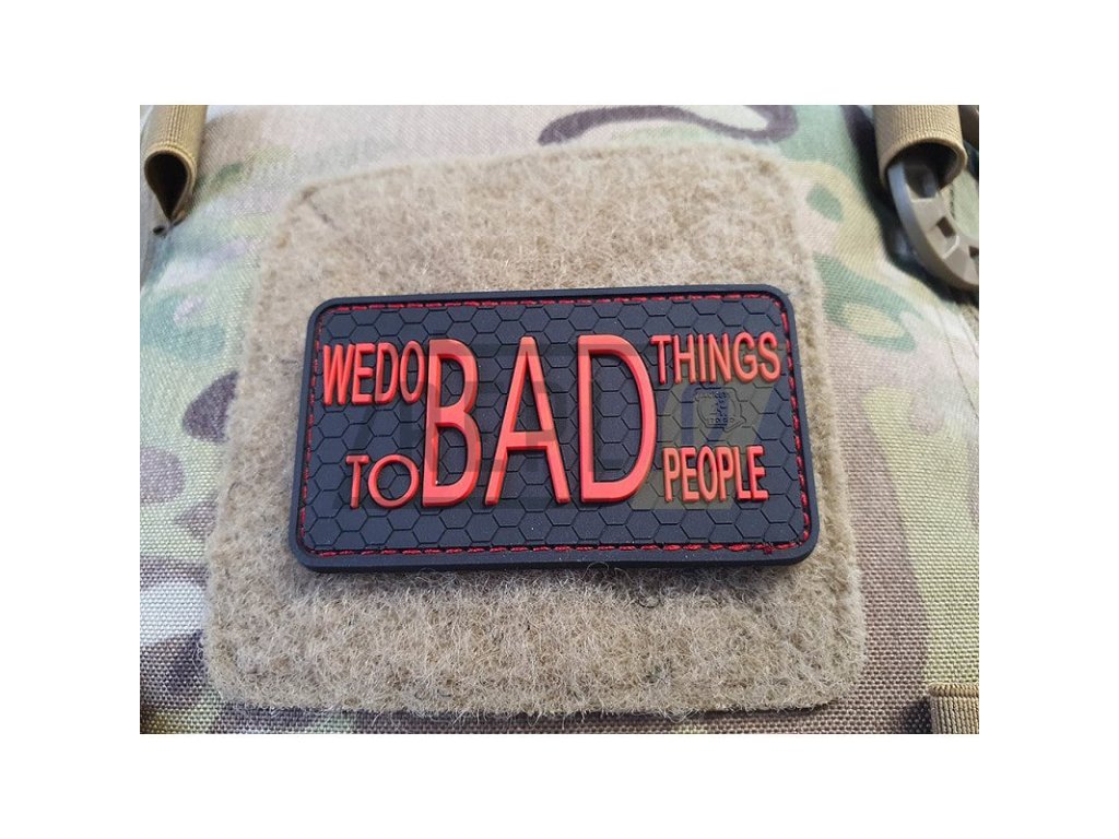 Plastová 3D nášivka s nápisem "We do bad things to bad people" (Špatným lidem děláme špatné věci). Rozměr cca 7,5 x 4,2 cm, na rubu se suchým zipem.