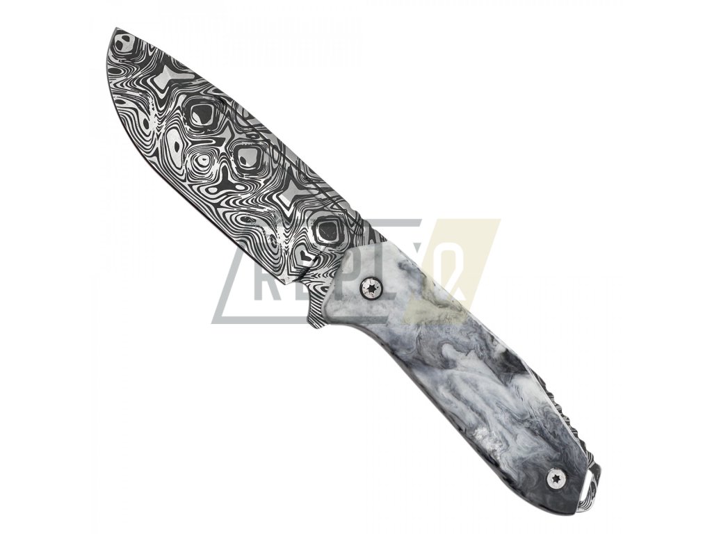 Společnost Takumitak s čínskými kořeny, nyní sídlící v kalifornském Ontariu, se již řádku let specializuje na výrobu nožů s robustní Full-Tang čepelí všech možných tvarů a velikostí. Jejich cílem je nabídnout co nejširší sortiment nožů, jenž splní požadavky každého náročného zájemce.Tento nůž se může chlubit robustní, 3.95mm tlustou čepelí z nerezové oceli 3cr13 s leptanou povrchovou úpravou věrně imitující damaškovou ocel. Rukojeť je zhotovena ze světélkující pryskyřice se stylovým kouřovým zabarvením. Součástí balení je i spolehlivé pouzdro z nylonu 1680D, kompatibilní se systémem MOLLE.