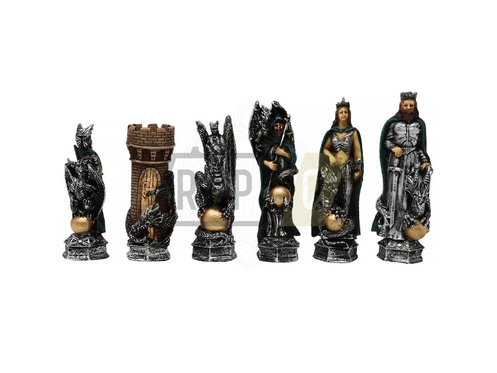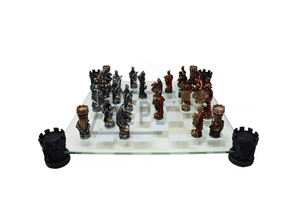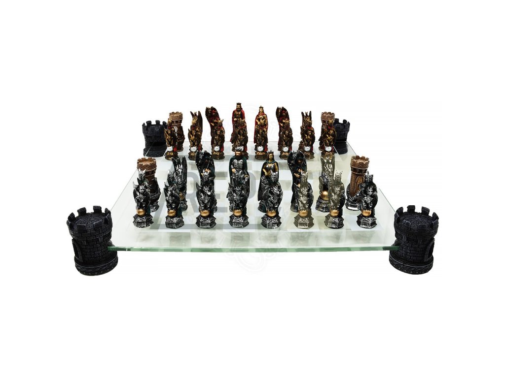 Šachy Král Artuš zlato-stříbrně šachové figurky se skleněnou šachovnicíŠachové figurky jsou detailně propracované a ručně malované.
