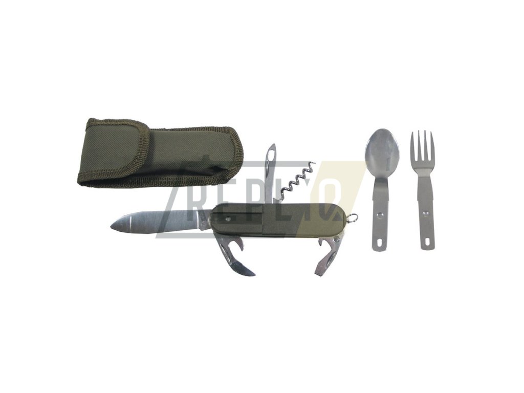Zavírací kapesní nůž s příborem. Celková délka 18,5 cm, délka čepele 8 cm. Včetně nylonového pouzdra.