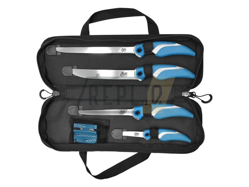 Taška/pouzdro, ve kterém jsou nože umístěné, je vyrobené z odolného nylonu, zapíná se na zip s dlouhými, pogumovanými táhly, takže se dobře rozepíná/zapíná i v rukavicích nebo se studenými (méně citlivými) prsty. Pouzdro je vyztužené, aby nože lépe chránilo a vybavené jednoduchými, ale spolehlivými popruhy pro přenášení v ruce.