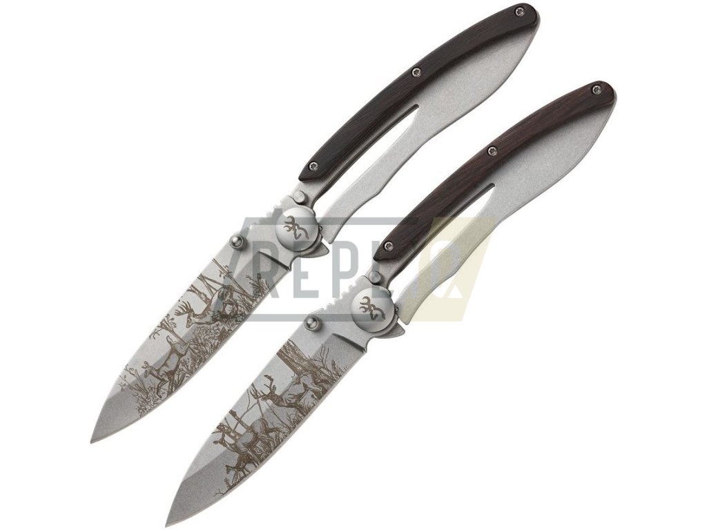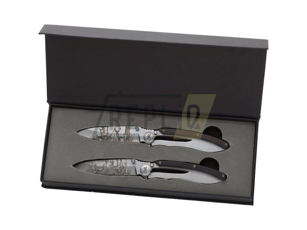 Sada dvou zavíracích nožů s loveckou tématikou. Lehký, elegantní design umocňuje ořechové dřevo na rukojeti. Od proslulé americké značky Browining.