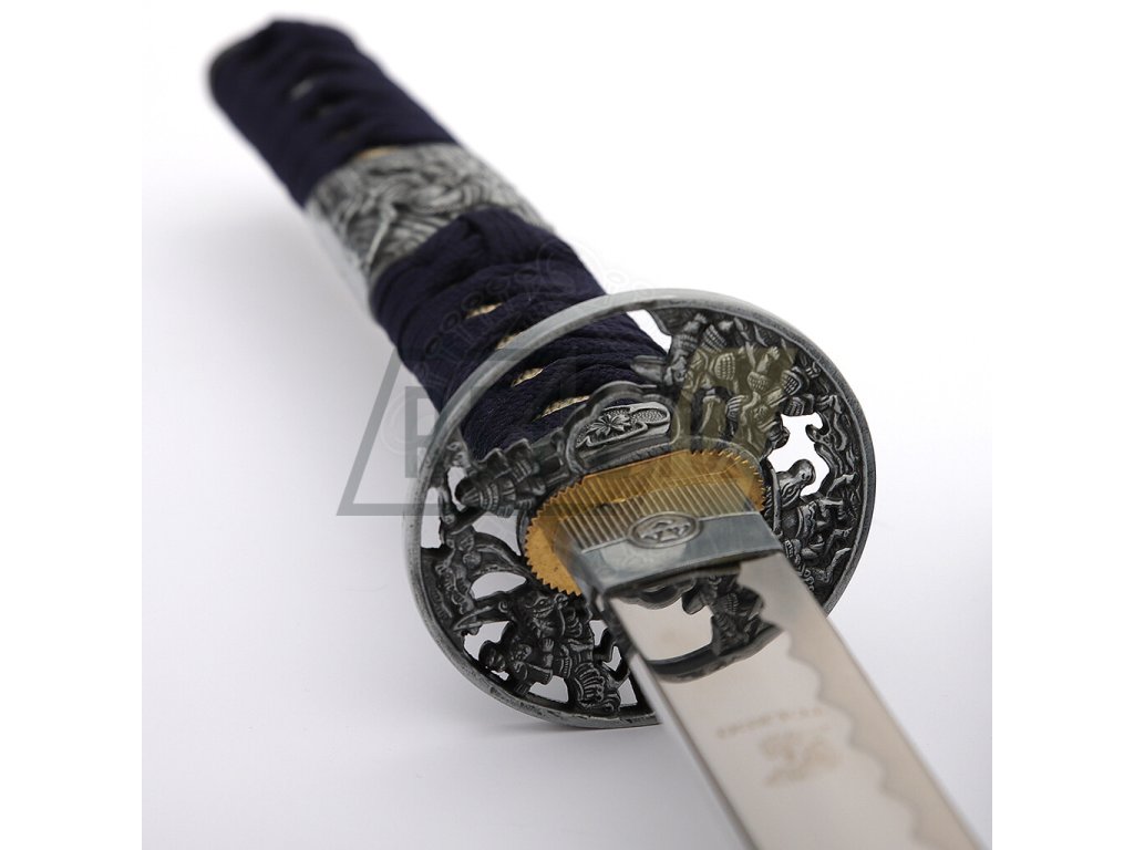 Na tsubě jsou vyobrazeni samurajové na bojišti
