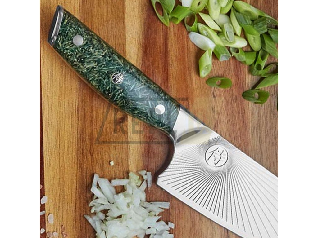 Mohutná barevná rukojeť z rýžových zrn, která jsou spojena epoxidovou pryskyřicí Vám připomene, že to není jen obyčejný nůž. Stane se klenotem Vaší kuchyně a poskytne vzrušení a výkon, který Vás nadchne. Rukojeť je ozdobena středovým mozaikovým nýtem s japonským znakem samurajů. Trojité nýtování zajišťuje dokonalou pevnost, stabilitu a spojení zářícího ostří a rukojeti.