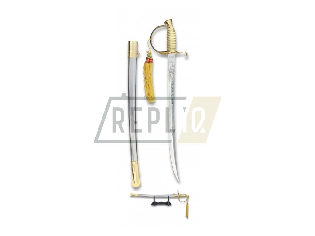 Šavle o délce 50 cm. Součástí je železná pochva a dřevěný stojan..