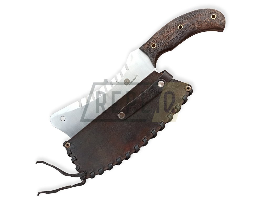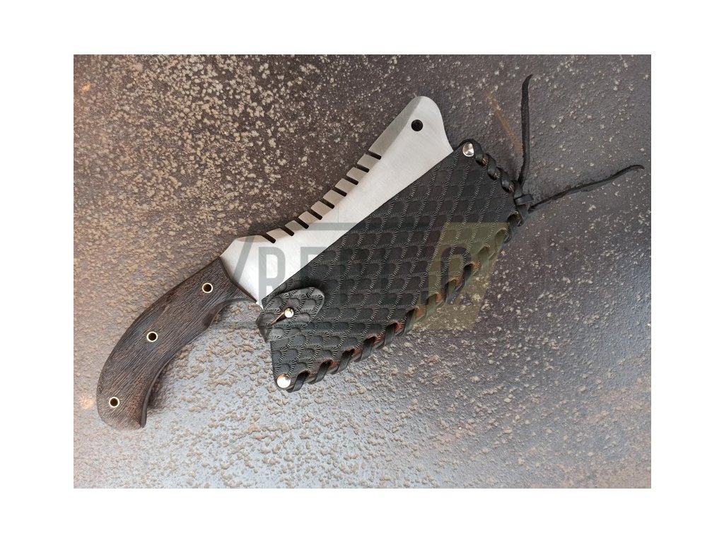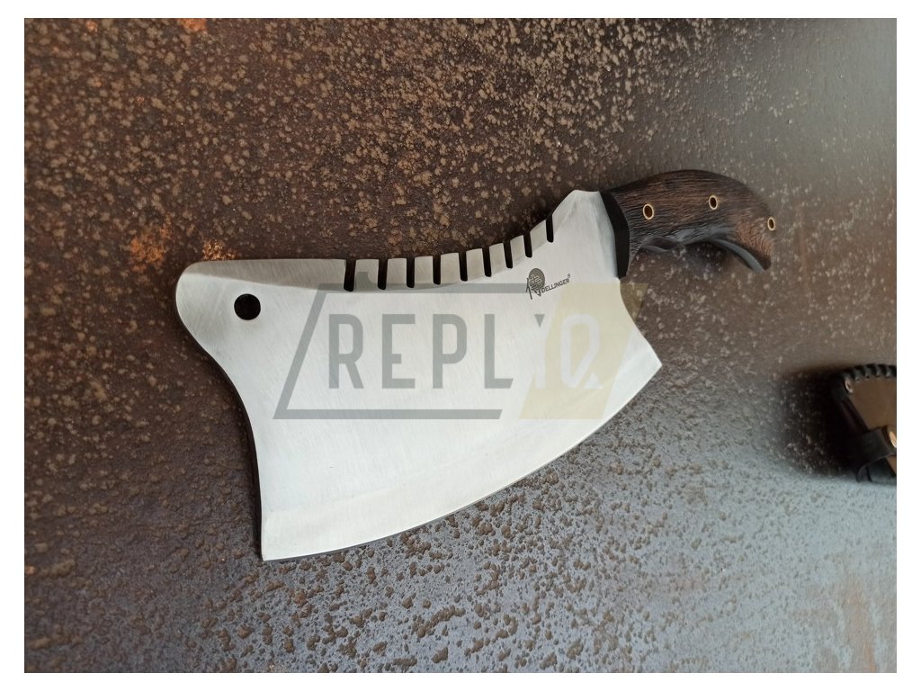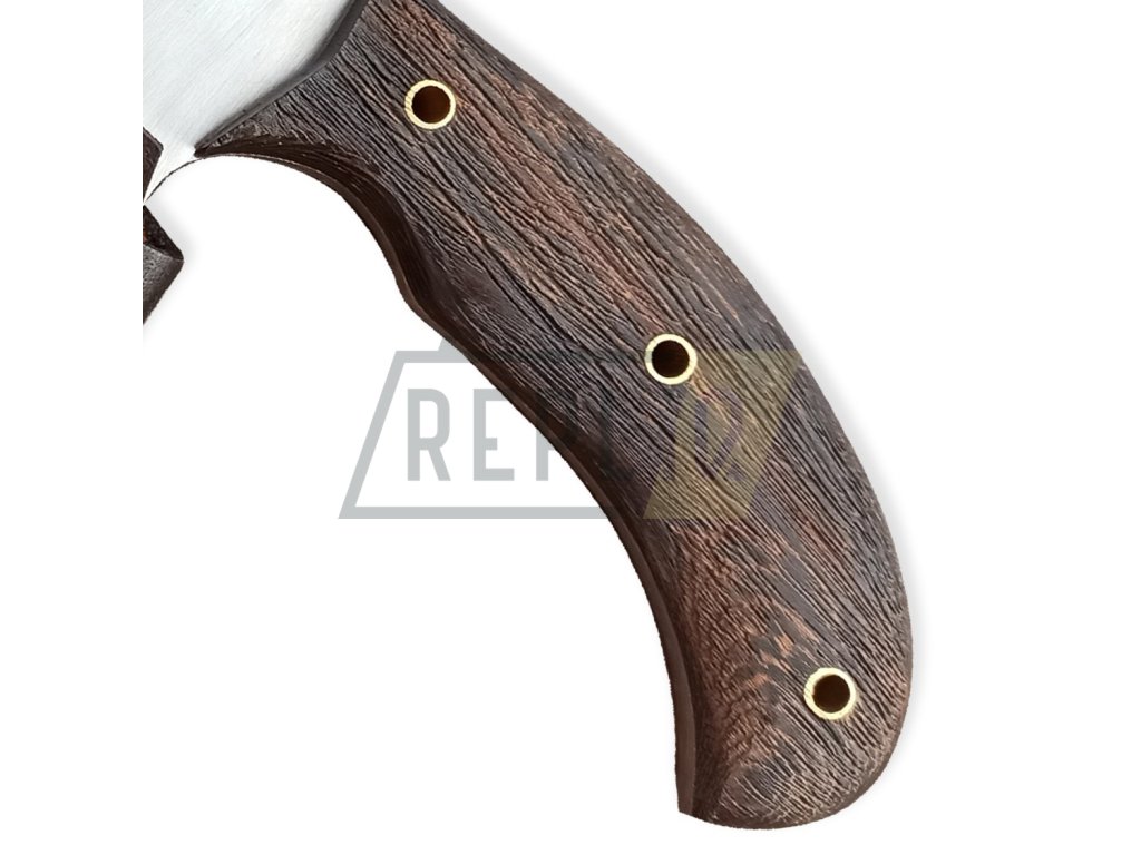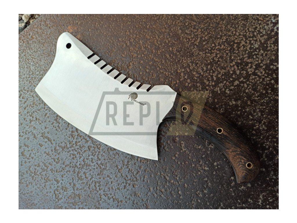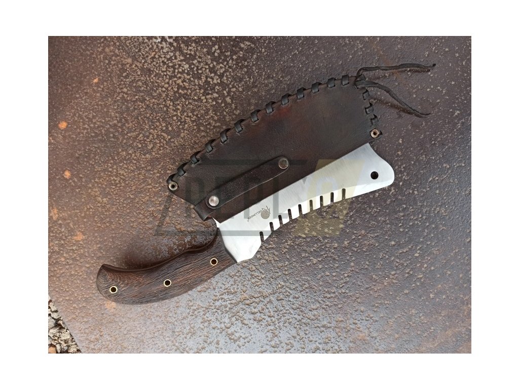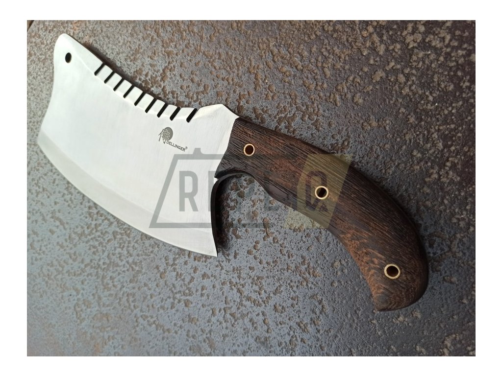 Tento výkonný nástroj je ručně kovaný a zpracovaný z oceli D2. Po přesném a pečlivém vytvrzení, temperování a žíhání dosahuje tvrdosti HRC 60-62. Jeho ostří jen tak někdo, nebo něco nepoškodí. Nádherná rukojeť tohoto sekáčku je ručně tvarována z kusu afrického tvrdého dřeva Wenge, které je olejováno Tungovým olejem a voskováno včelím voskem. Duté kolíky jsou vyrobeny z mosazi.