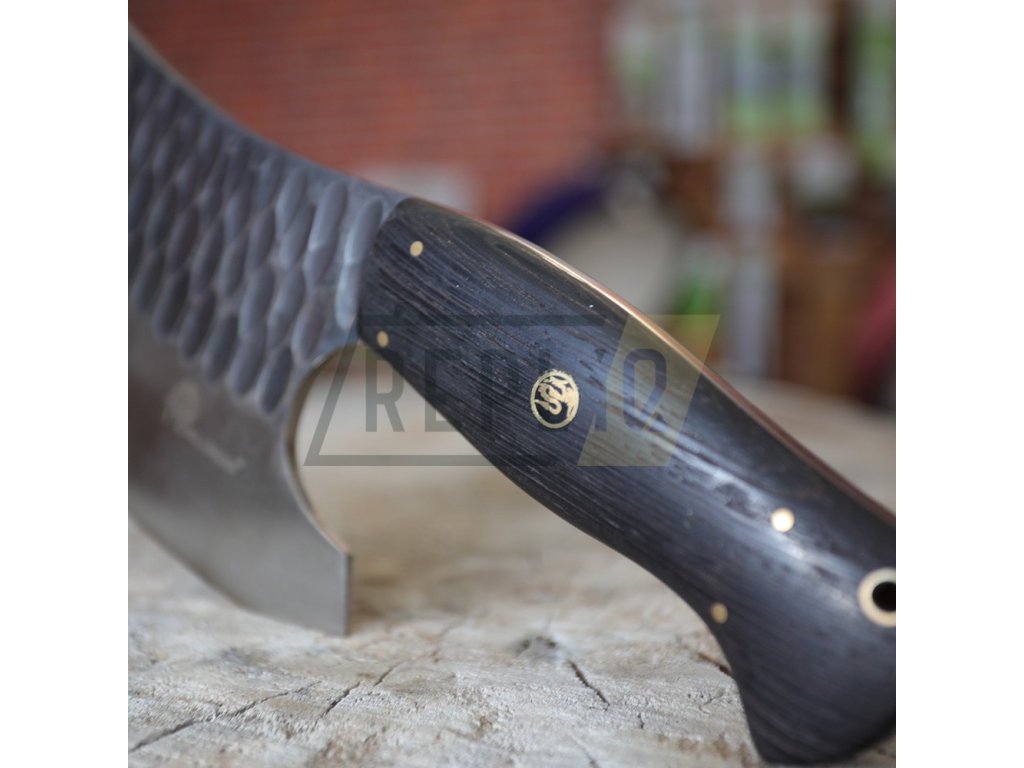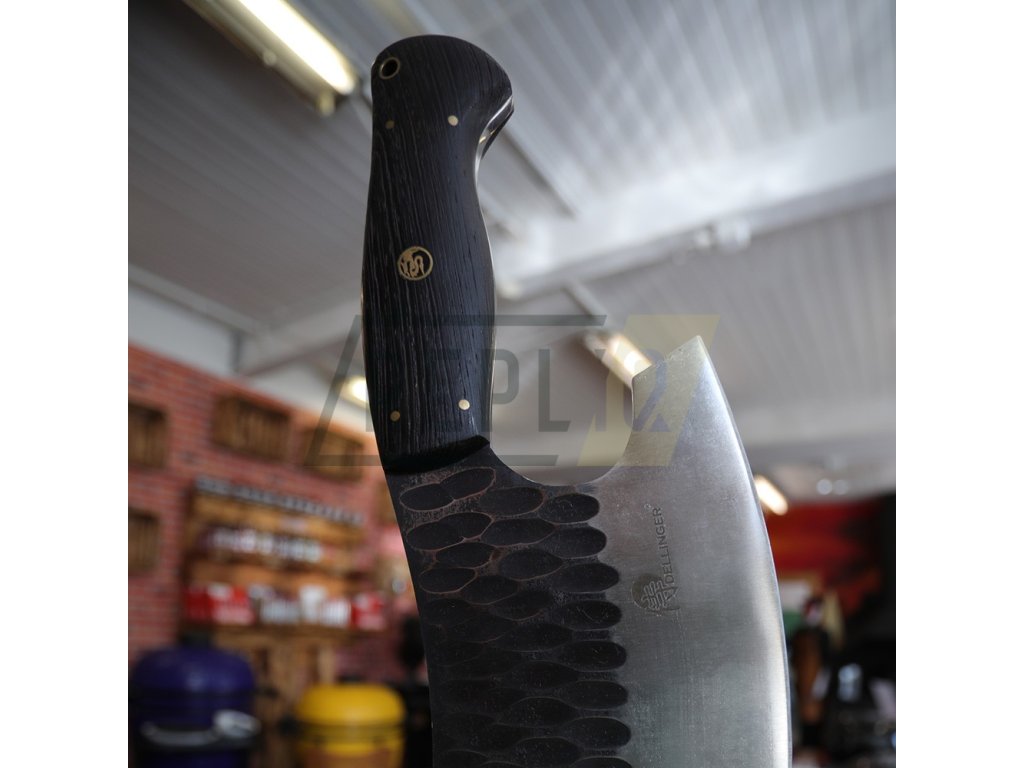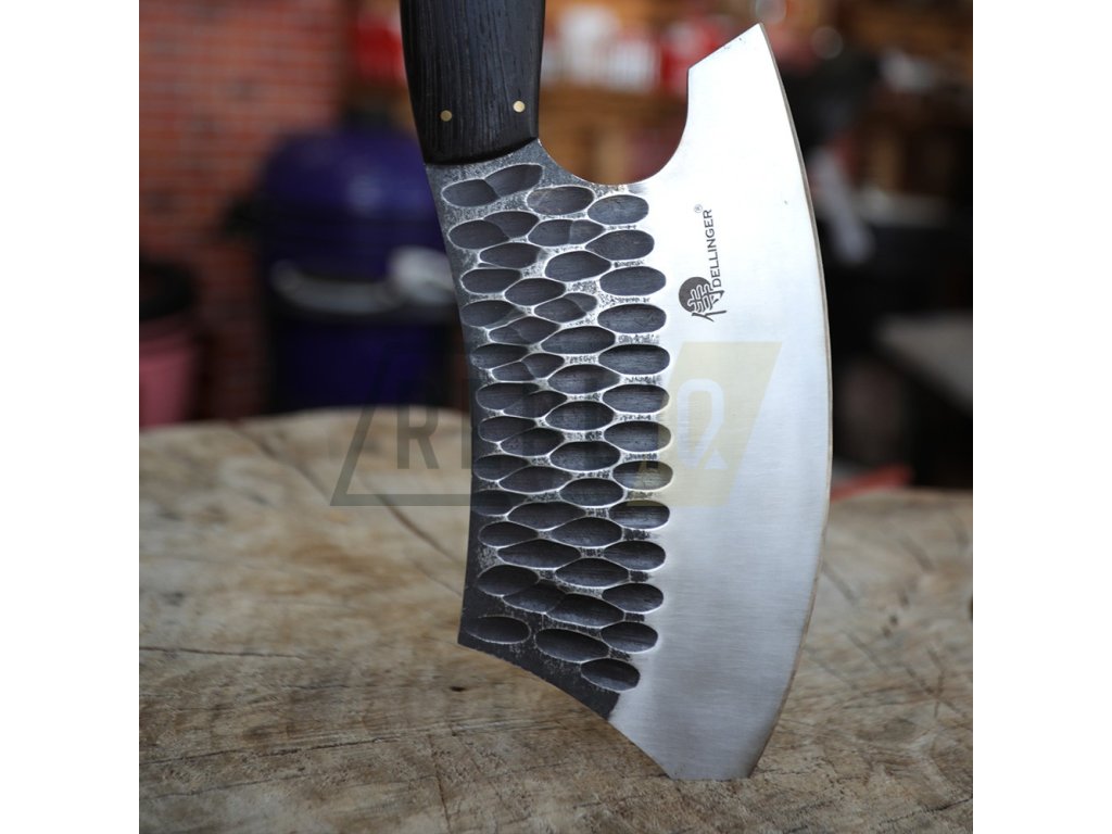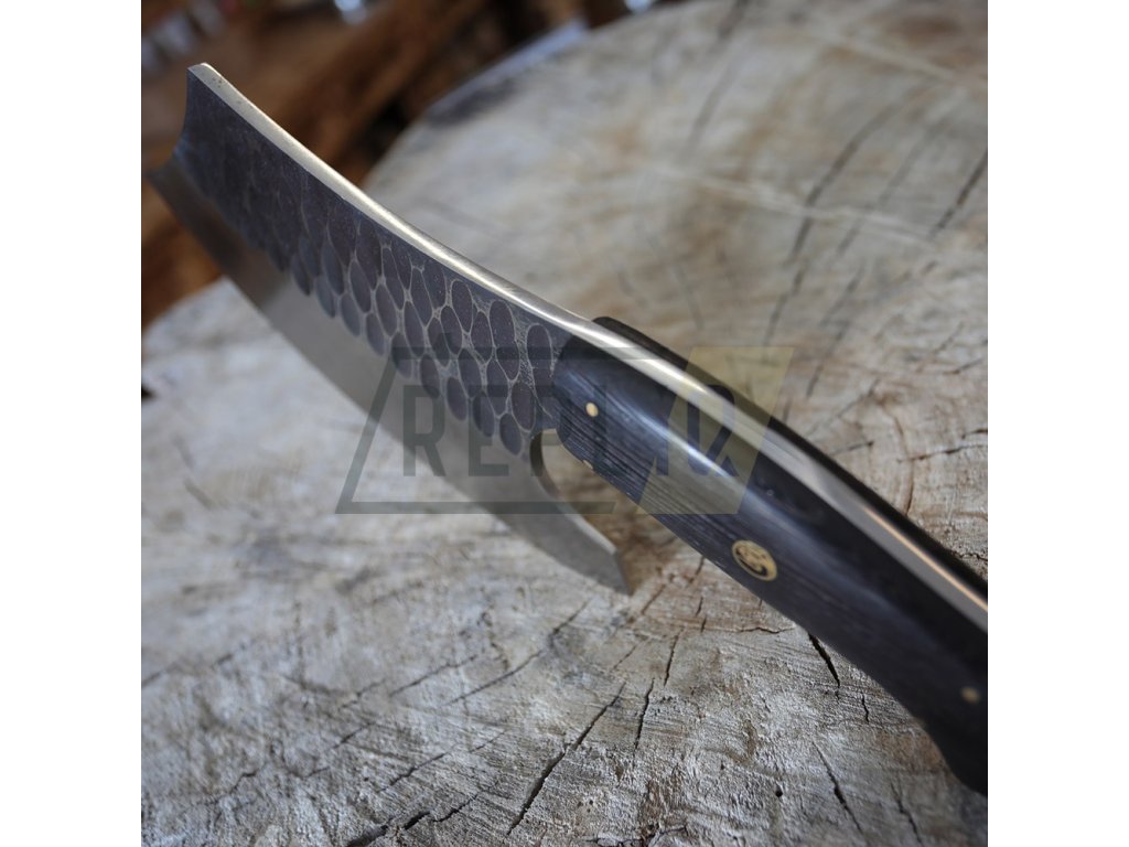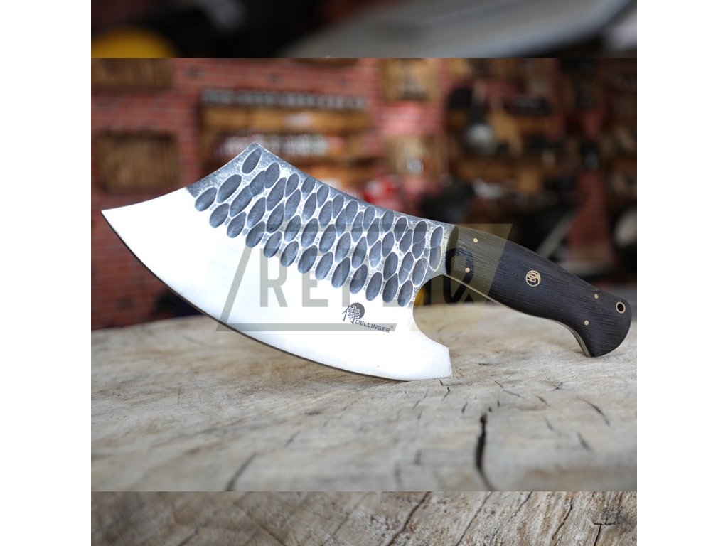 Tento jedinečný nůž ve tvaru sekáčku je zaslíben BBQ a grilování. Razantní ostří nezastaví ani menší kosti. Zaoblená čepel nože umožňuje houpavé řezy, díky kterým bude krájení ryb, masa a bylinek jednodušší. Tento nůž je kovaný z nástrojové oceli D2. Rukojeť je vyrobena z kartáčovaného dřeva Wenge. Po přesném a pečlivém vytvrzení, temperování a žíhání dosahuje tvrdosti HRC 60-62. Jeho ostří jen tak něco nepoškodí. Budete chtít ukázat každé návštěvě jaký kus překrásného železa se skrývá ve vaší kuchyni.