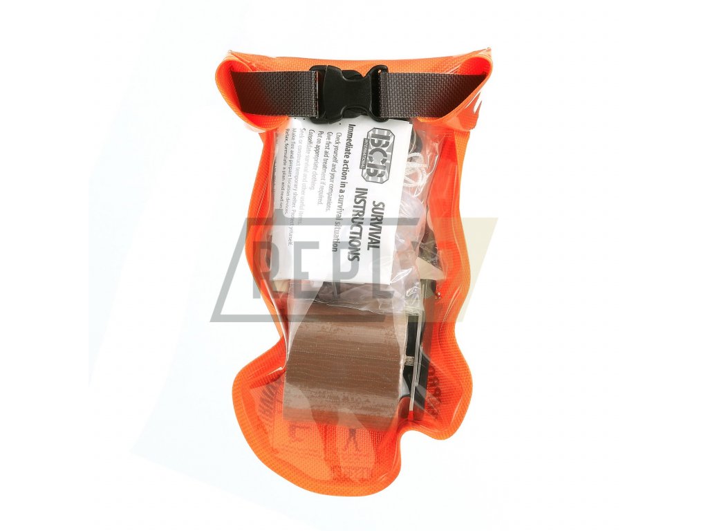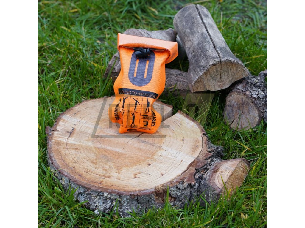 Lehká sada pro přežití zabalená ve vodotěsném pouzdru. Napůl transparentní provedení usnadňuje hledání a zaručuje přehlednost. Rolovací uzávěr s přezkou zabraňuje proniknutí vody a vlhkosti. Stahovací šňůrka kolem krku. Vyobrazení nouzových optických signálů na zadní straně pouzdra.