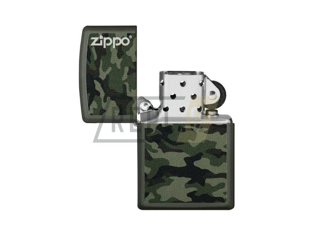 Klasický benzínový zapalovač ZIPPO v maskovaném provedení a v dárkové krabičce. Je vyrobený z odolného kovu a plamen zapalovače odolá i větru.