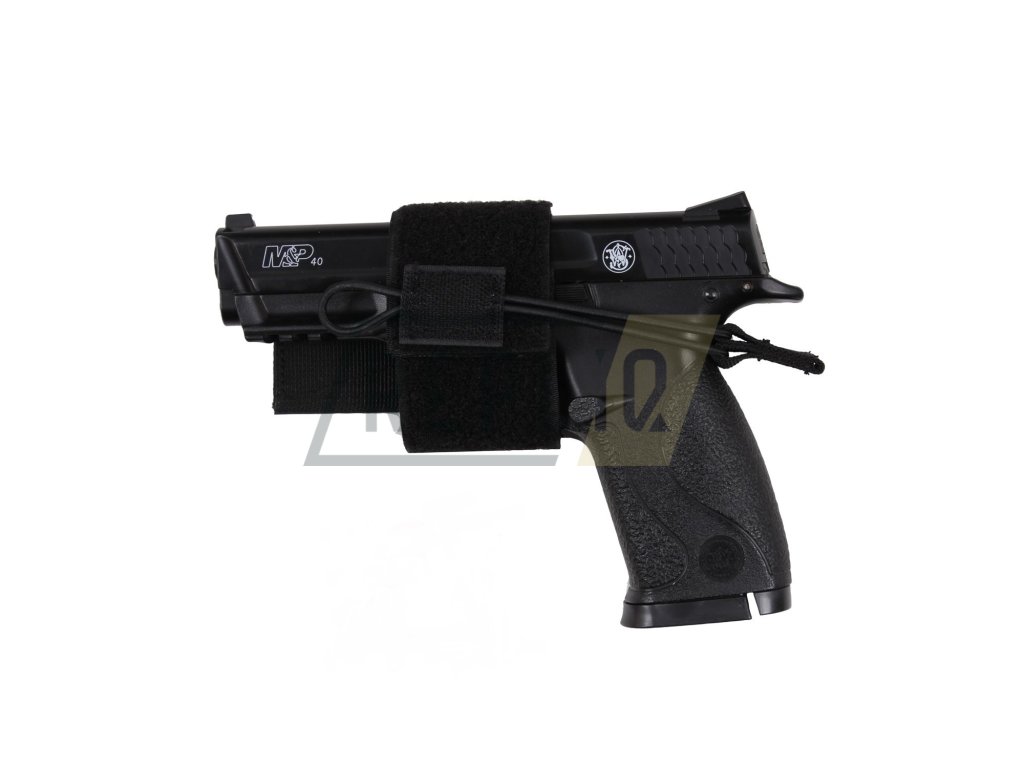 Univerzální pistolové pouzdro, které můžete díky zadnímu panelu suchého zipu připojit ke kompatibilním vestám, batohům či taškám. Suchým zipem také lze regulovat průměr otvoru na zbraň, pouzdro je kompatibilní s většinou palných zbraní služební velikosti. Zbraň se v pouzdru fixuje pomocí elastické šňůrky.