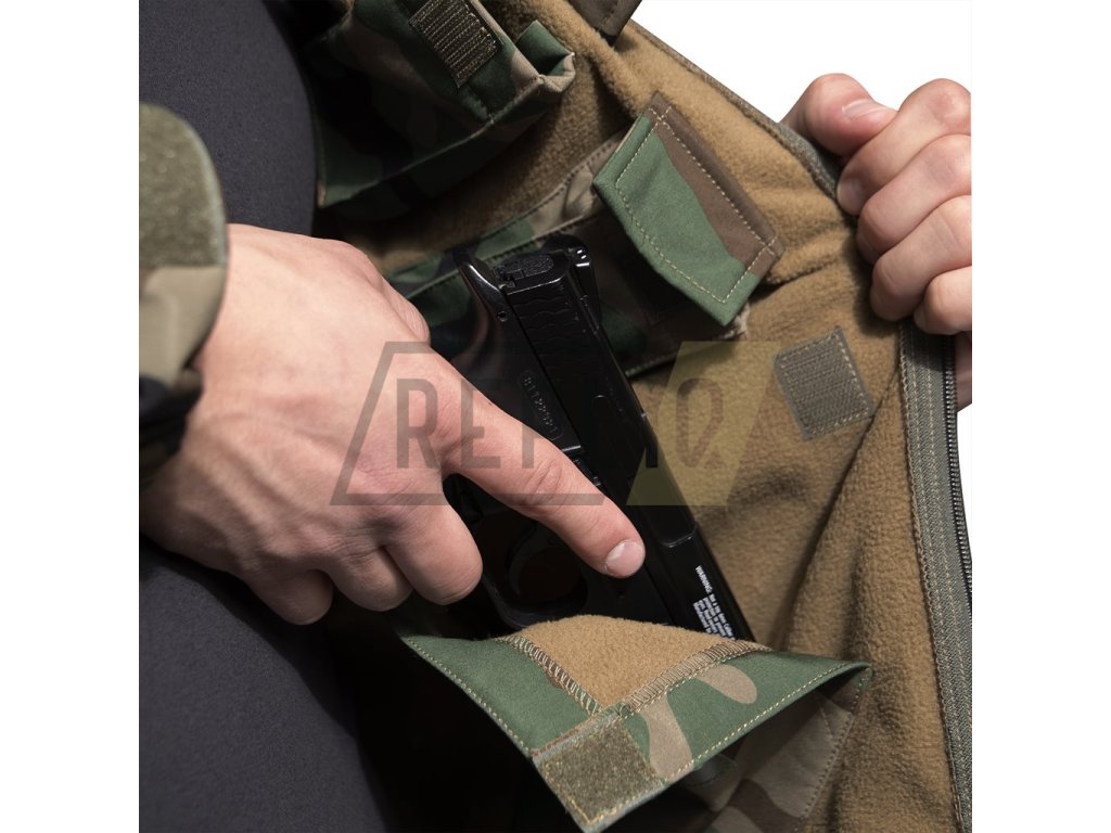 Taktická softshellová bunda s fleece podšívkou, kterou lze využít pro skryté nošení vaší zbraně. Tato bunda byla vyvíjena na základě požadavků tajných služeb. Její hlavní předností je skryté nošení krátké zbraně s možností až čtyř dalších zásobníků, které jsou ihned k dispozici. Dvoucestný zip umožňuje mít pootevřenou bundu ve spodní části pro lepší vyndávání zbraně, kterou máte u sebe v pouzdře na opasku. Určitě oceníte velmi prakticky schovanou kapuci v límci. Pro rychlé efektivní větrání použijete zipy schované v podpaždí. Do menších kapes s velcro panely na bicepsech v pohodě uložíte mobilní telefon a díky otvoru na kabel použijete sluchátka. Na zadní části bundy najdete dvě kapsy, které tvoří tunel. Tento tunel můžete využít pro nošení dalších potřebných věcí.
