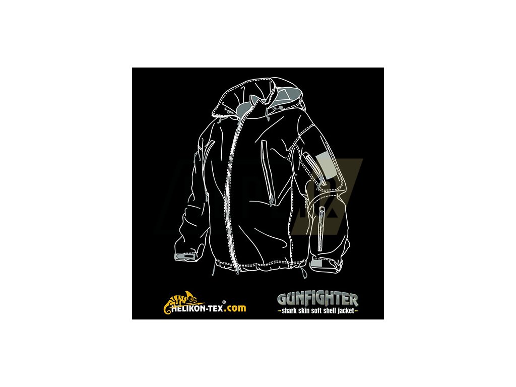 Lehká softshellová bunda Gunfighter z materiálu Shark Skin - třívrstvé elastické látky, která poskytuje dostatečnou tepelnou izolaci, ochranu proti větru a vlhkosti a zároveň je velmi prodyšná. Vnější povrch je potažený teflonem pro lepší ochranu před vodou a znečištěním. Z vnitřní strany je soft fleecová a síťovaná podšívka. Kapuci lze snadno upravovat bez vyndání rukou z kapes šňůrkami schovanými v obou předních kapsách.